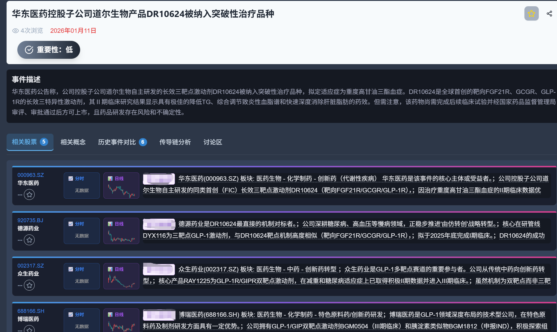 华东医药控股子公司道尔生物产品DR10624被纳入突破性治疗品种