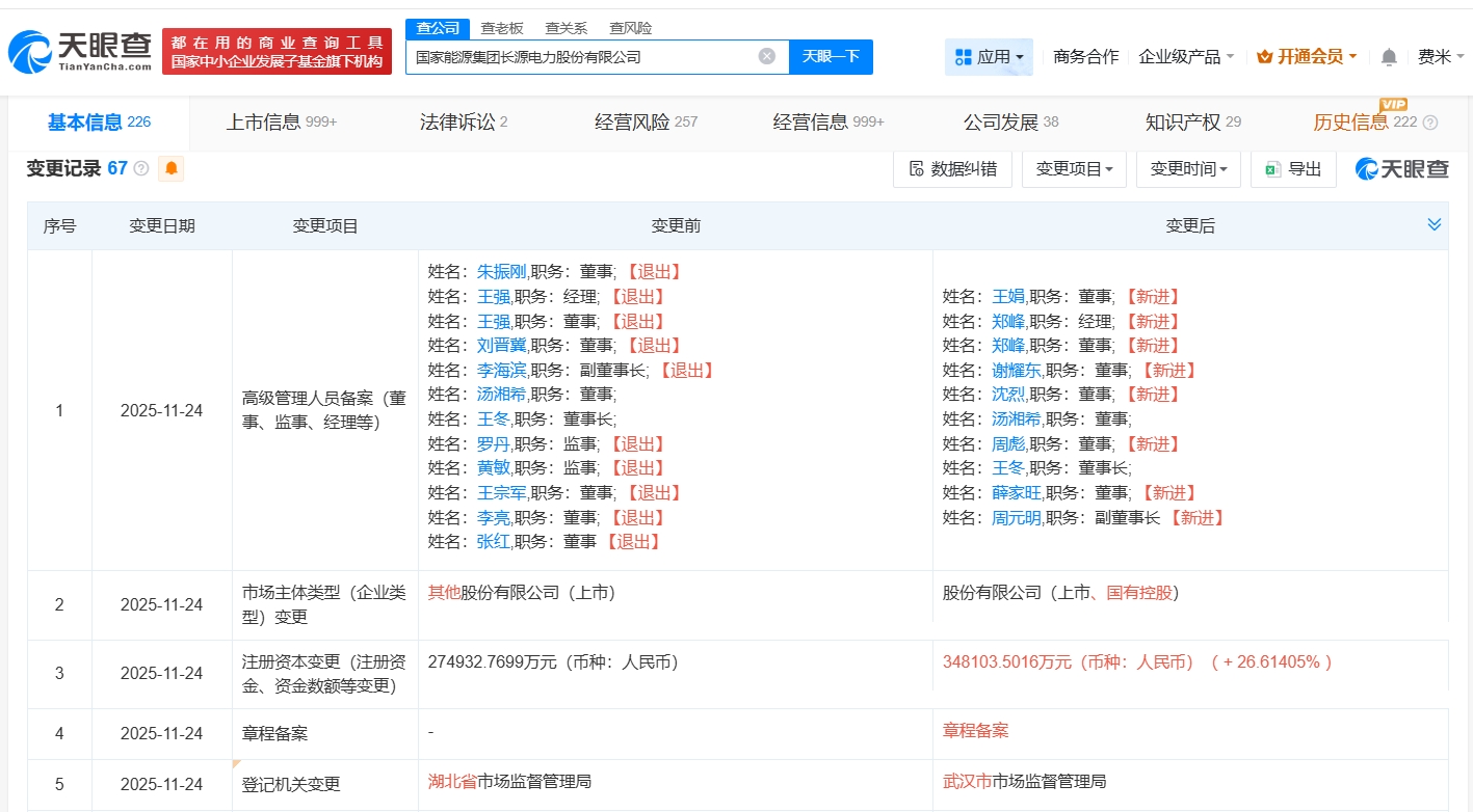 南方财经11月27日电,天眼查工商信息显示,近日,长源电力(000966)发生工商变更,注册资本由约27.5亿人民币增至约34.8亿人民币,增幅约27%,同时,多位主要人员发生变更。国家能源集团长源电力股份有限公司成立于1995年4月,法定代表人为王冬,经营范围包括热力生产和供应、新兴能源技术研发、基础化学原料制造等。股东信息显示,该公司由国家能源投资集团有限责任公司、中国能源建设集团有限公司、湖北省铁路发展基金有限责任公司等共同持股。
