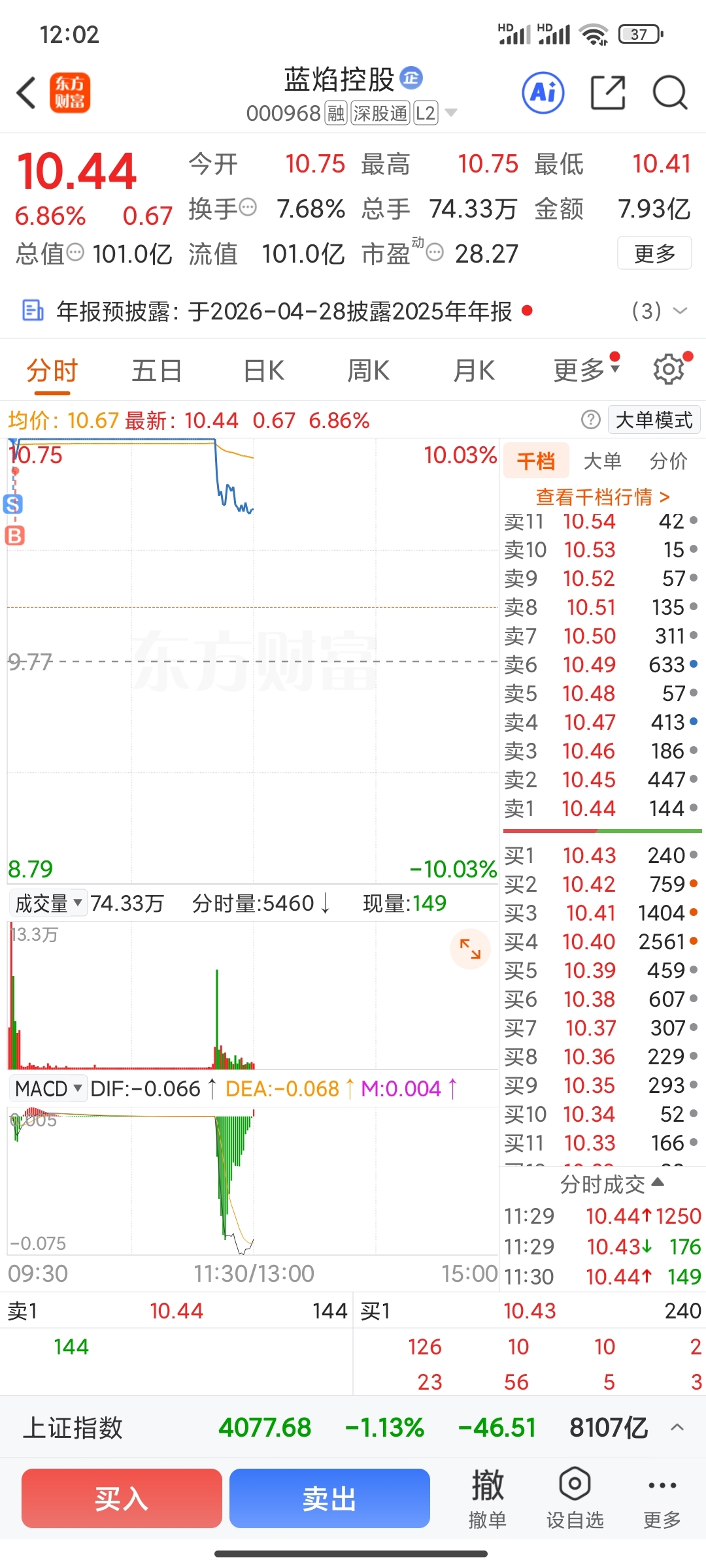 $蓝焰控股(SZ000968)$ T了1.6个点还以为完美了,哎,当时48万手封单啊,做龙一多好!没想到还是开了,还直下4个点,没那个命