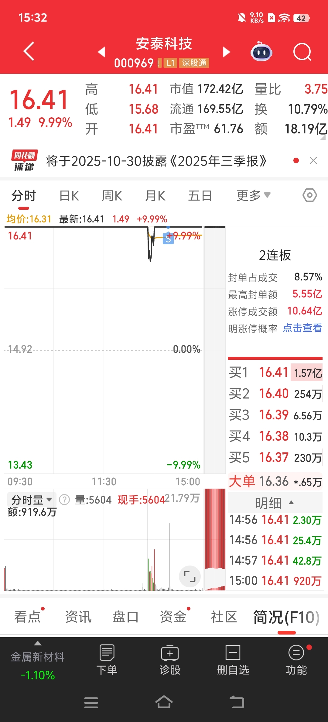 别骗出去了,第一炸板我忍住了,第二次看它快炸板我卖了一半,昨天卖了一半,只剩1/4了,下午应该是换手率不够,封单没吃够筹码故意撤单了,多亏了它我这个月没亏钱,持仓的科技票跌成狗