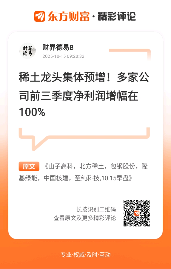 //@财界德易B :稀土龙头集体预增!多家公司前三季度净利润增幅在100% $安泰科技(SZ000969)$$山子高科(SZ000981)$$石大胜华(SH603026)$