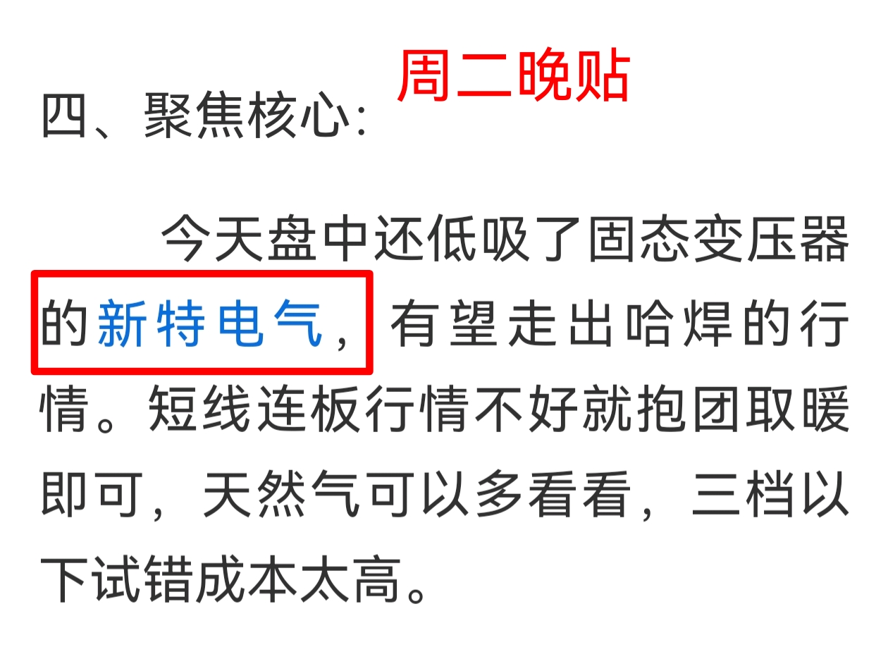 在观察盘面10分钟左右,立刻找到了当日的活口,那就是昨晚帖子中提到的专精特新板块,变压器龙头新特电气在五日线承接非常好,若溪选择果断加仓,截至收盘临近涨停,品茗科技今天也是落袋为安了,高切低加仓了新特,全天近40%的收益。