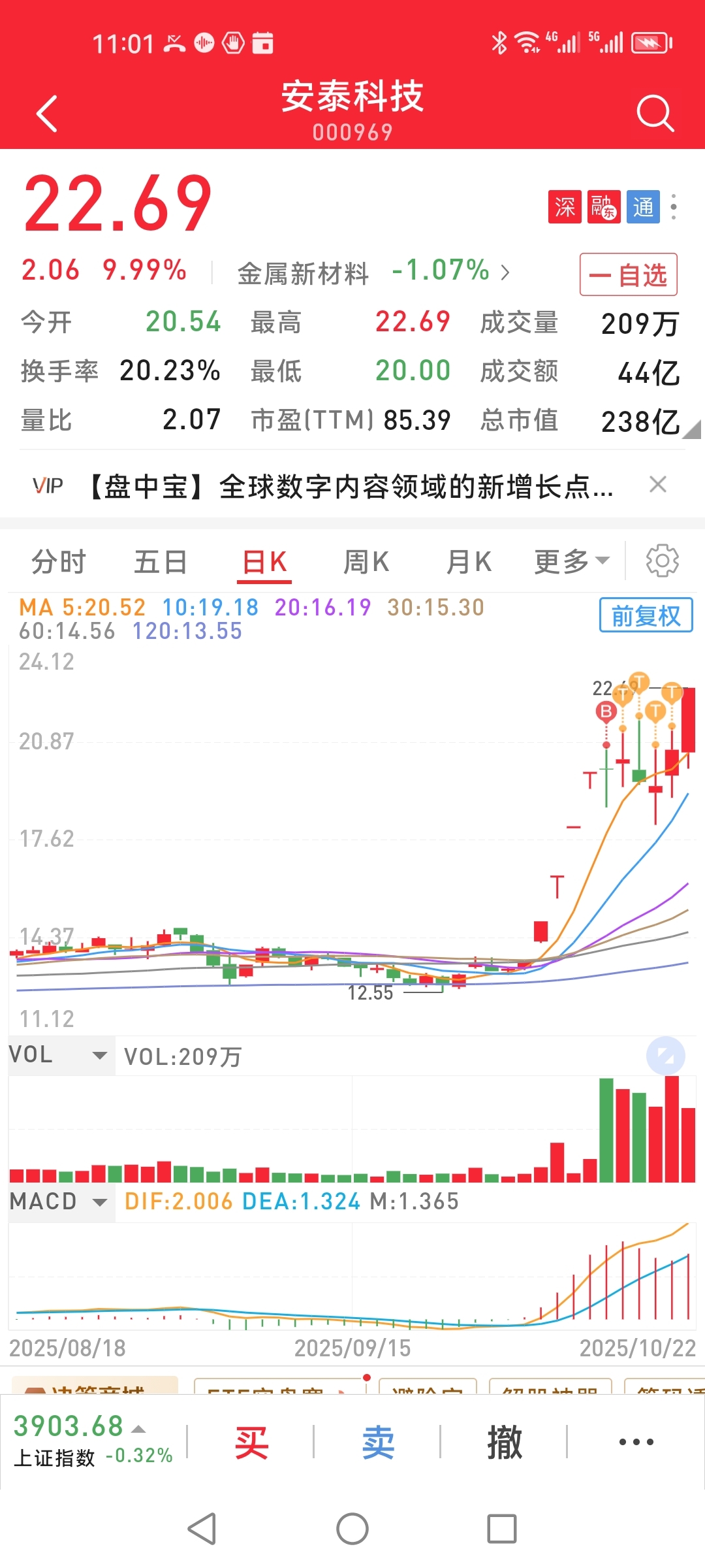 $安泰科技(SZ000969)$ 该股连续五天上下波动很大,本人坚定看好,每天做差价,终于等到了向上突破!太不容易了