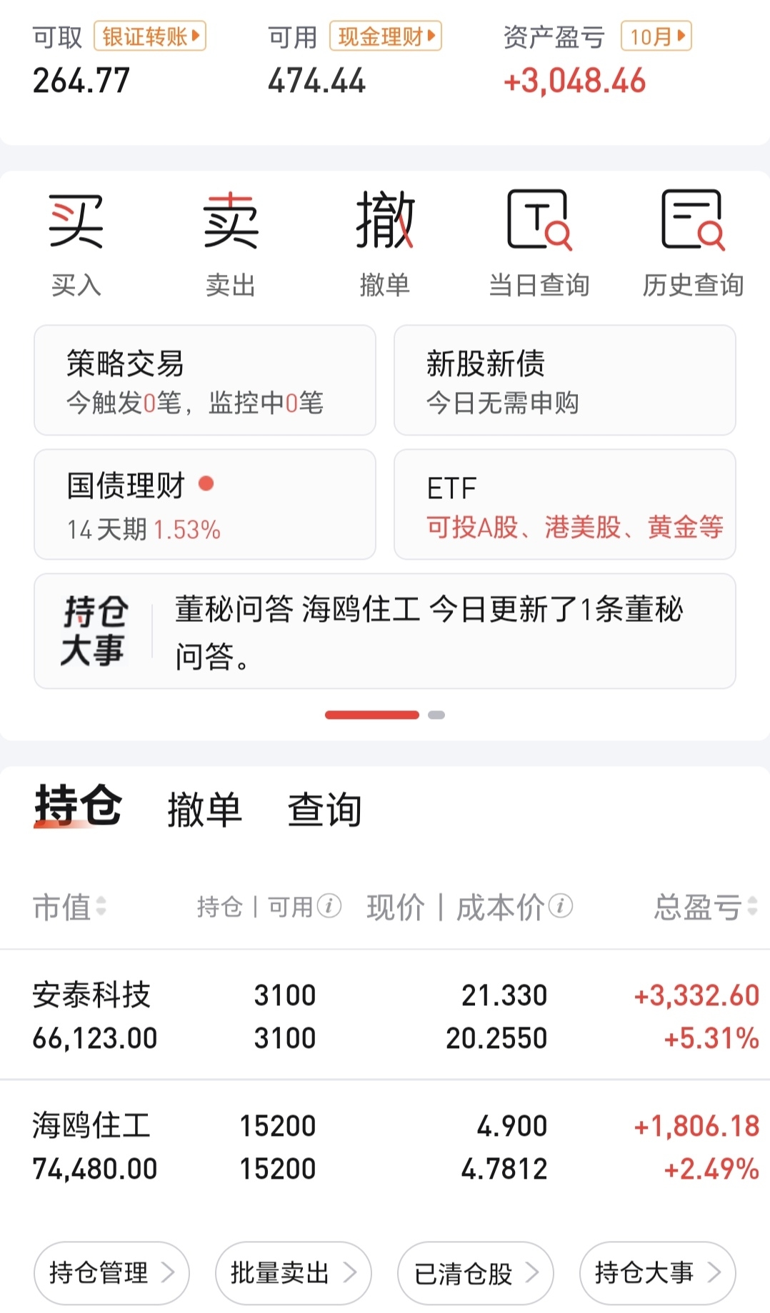$安泰科技(SZ000969)$ 这两个股好慌啊,好不容易这个月刚回本,心惊胆战的$海鸥住工(SZ002084)$