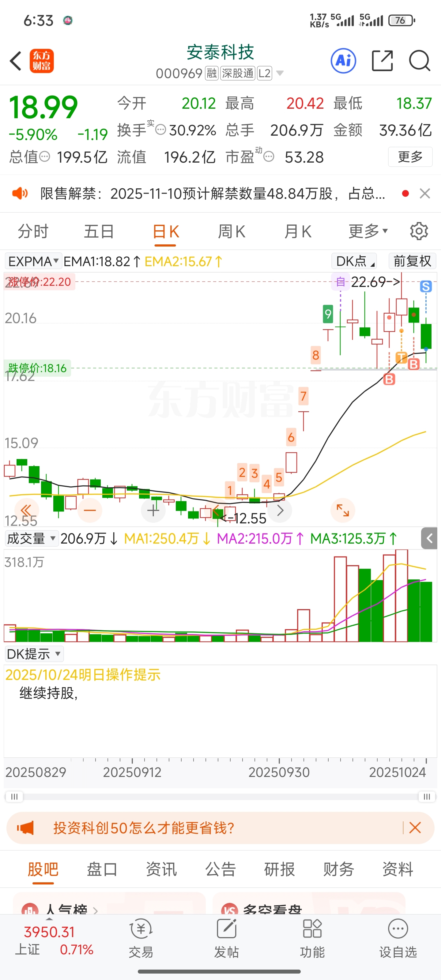 $安泰科技(SZ000969)$ 合锻我就是追进去第一天炸板了,没走,被a杀了然后打到ema1线两天没啥动静走的,然后进的安泰第一天又炸板了,现在安泰也打到这个线上了,我要是再没耐心等个几天,我就是真的不吃教训了