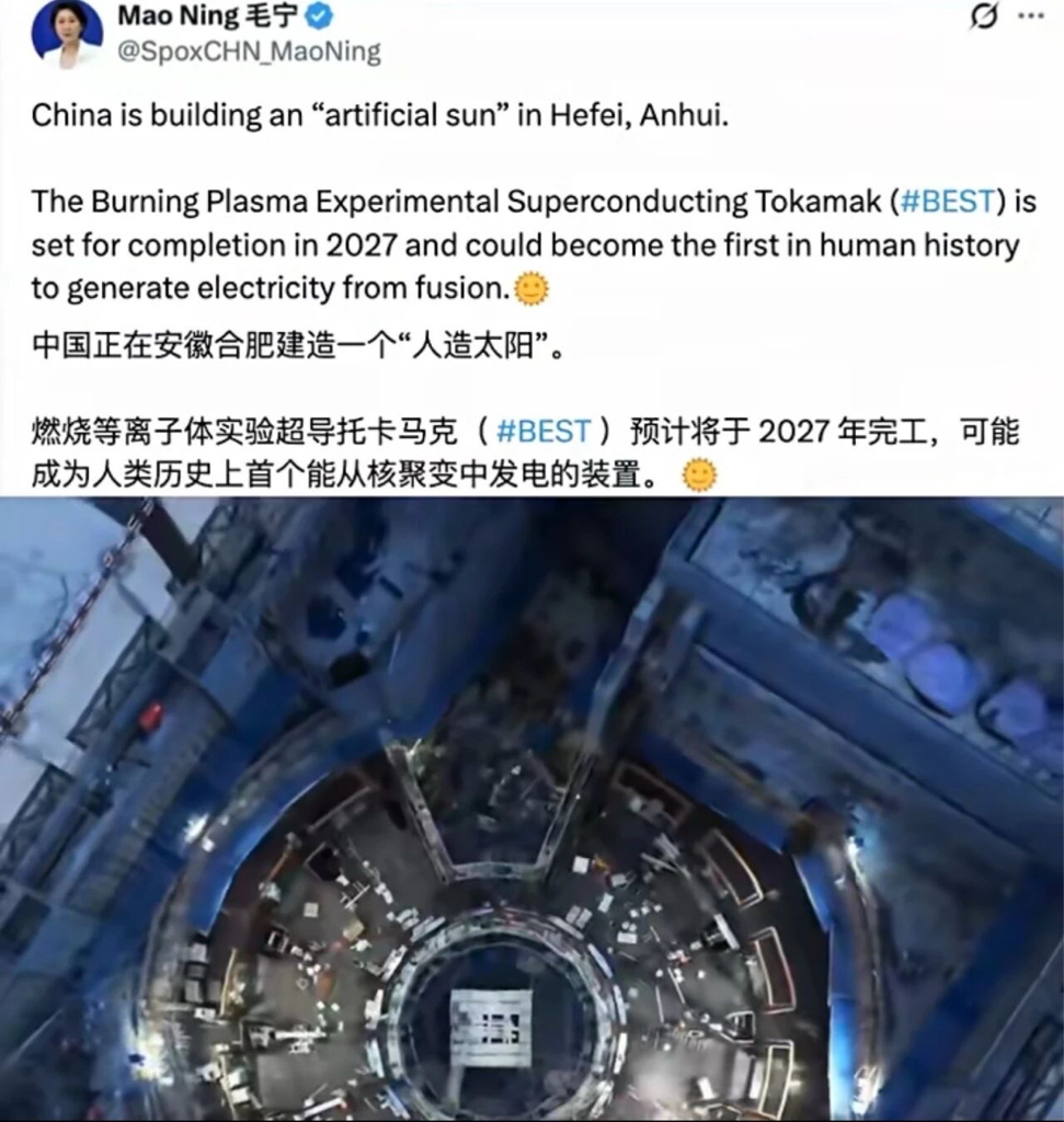 近日,外交部发言人、新闻司司长毛宁在海外社交平台上向世界分享位于合肥的“人造太阳