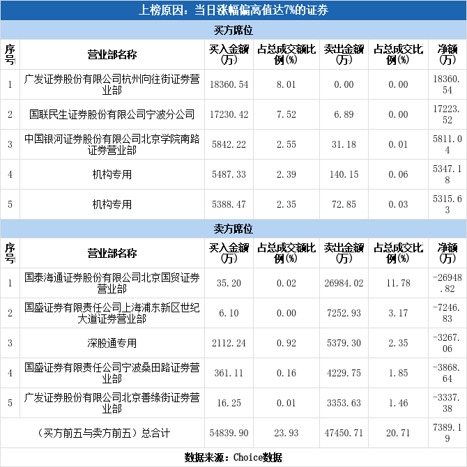 龙虎榜数据显示,今日共2个机构席位出现在龙虎榜单上,分别位列买四、买五。合计净买入1.07亿元,占龙虎榜净买额的144.3%。