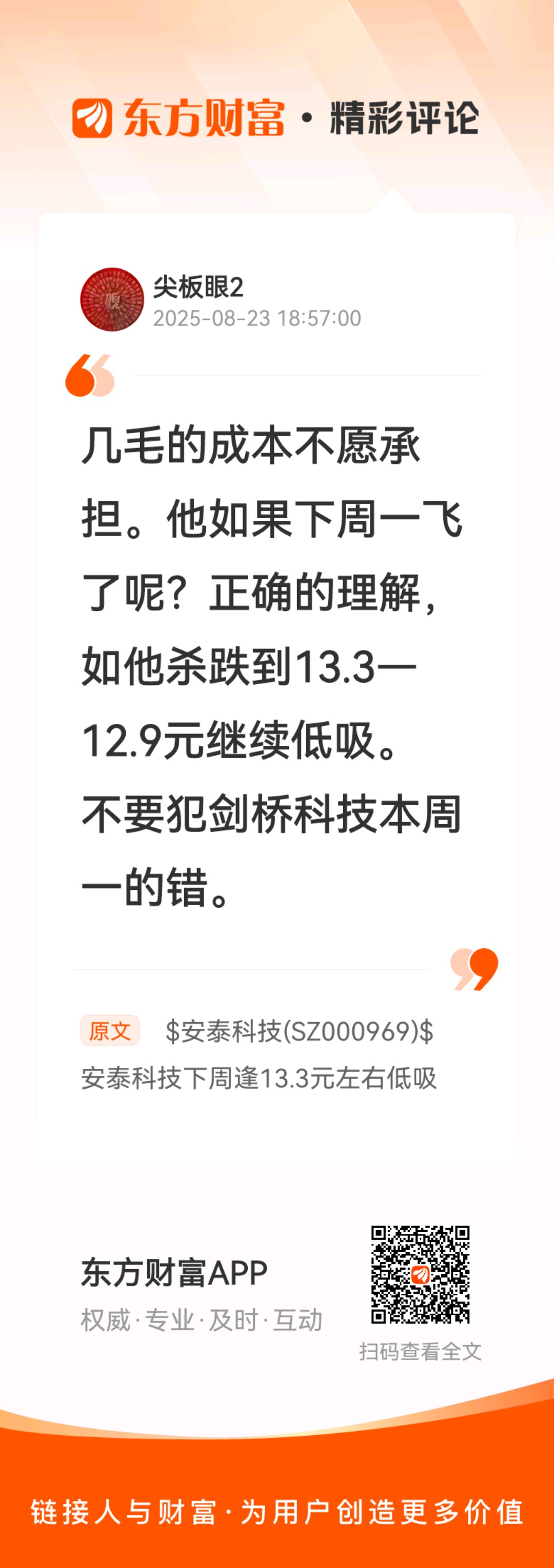 //@尖板眼2 :几毛的成本不愿承担。他如果下周一飞了呢?正确的理解,如他杀跌到13.3—12.9元继续低吸。不要犯剑桥科技本周一的错。