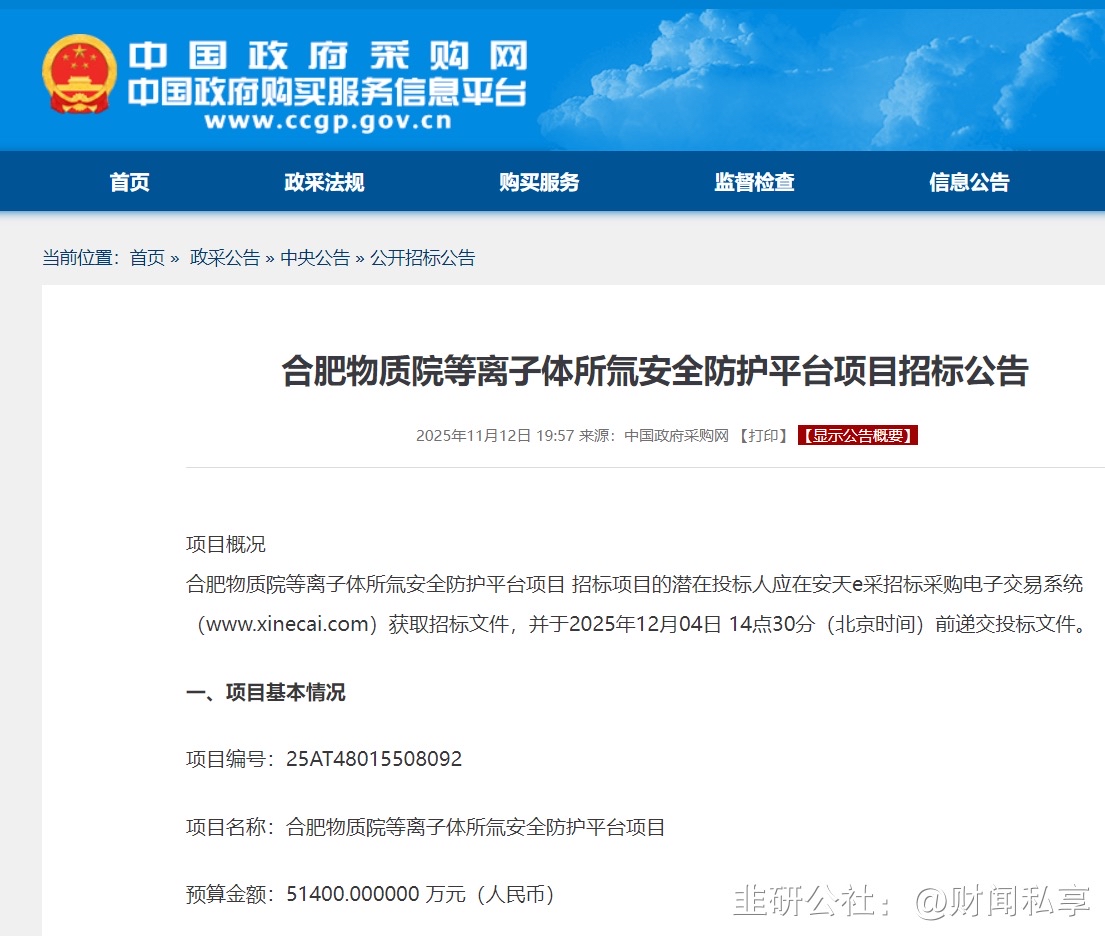 今晚中国政府采购网公布合肥物质院等离子体所四个招标项目涉及金额13亿