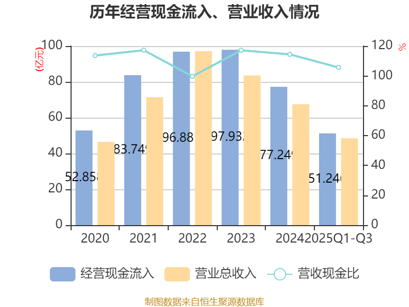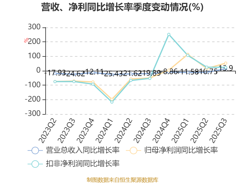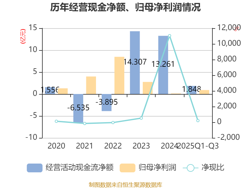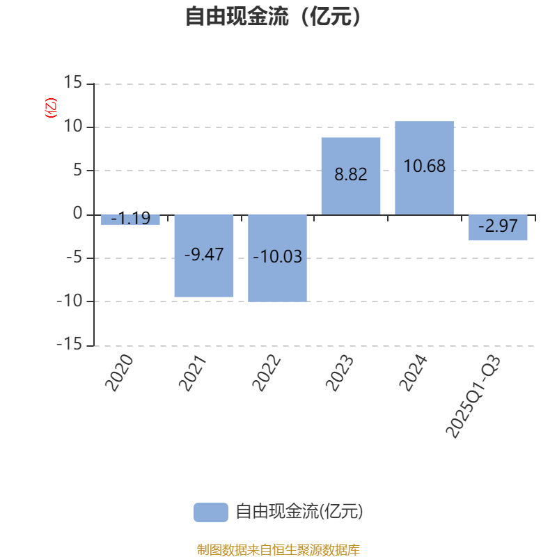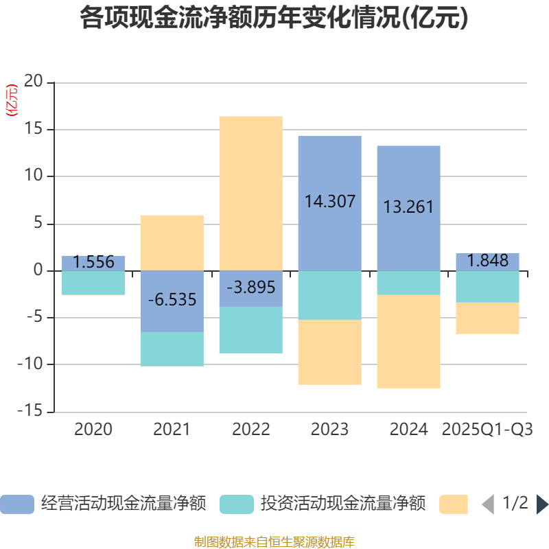 2025年前三季度,公司经营活动现金流净额为1.85亿元,同比下降80.2%;筹资活动现金流净额-3.35亿元,同比增加4.76亿元;投资活动现金流净额-3.39亿元,上年同期为-3.13亿元。
