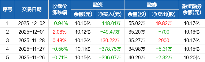 中科三环:融资净偿还148.01万元,融资余额10.1亿元(12-02)