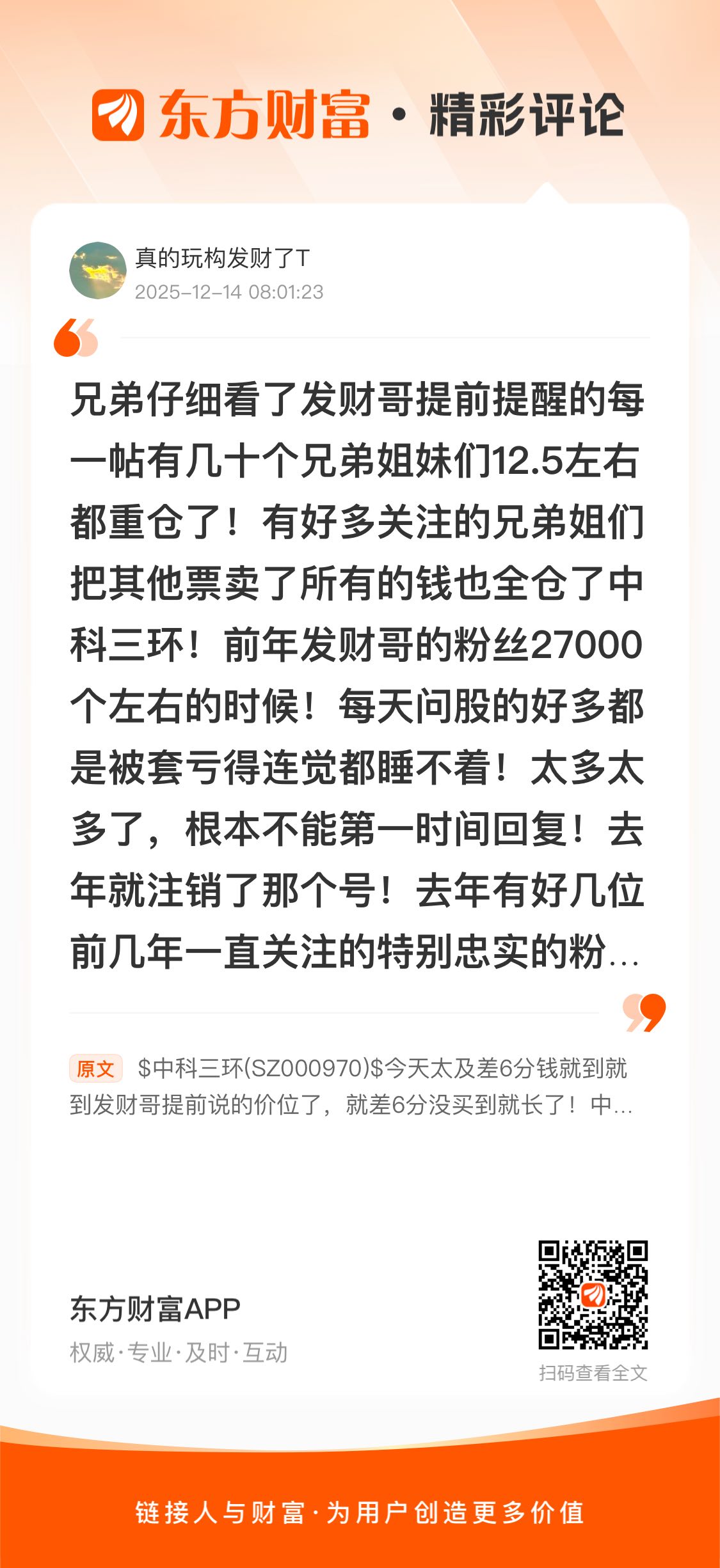 //@真的玩构发财了T : 回复 股友032O82T553 :兄弟仔细看了发财哥提前提醒的每一帖有几十个兄弟姐妹们12.5左右都重仓了!有好多关注的兄弟姐们把其他票卖了所有的钱也全仓了中科三环!前年发财哥的粉丝27000个左右的时候!每天问股的好多都是被套亏得连觉都睡不着!太多太多了,根本不能第一时间回复!去年就注销了那个号!去年有好几位前几年一直关注的特别忠实的粉丝,再三要求发财哥出来发言!去年发财歌又注册了一个一样的号,真的玩够发财!就在后面加了个T字!没想到短短时间又有了2988个粉丝俩!还好,现在能够第一时间回复!以后多了就不好说了,有可能看到就晚了错过买卖的最佳时机!希望以后粉丝们能够多多理解谢谢!