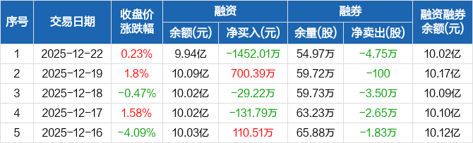 中科三环:融资净偿还1452.01万元,融资余额9.94亿元(12-22)