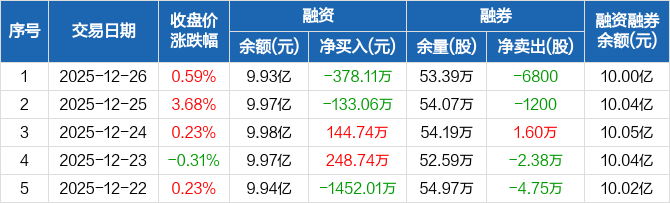 中科三环:融资净偿还378.11万元,融资余额9.93亿元(12-26)
