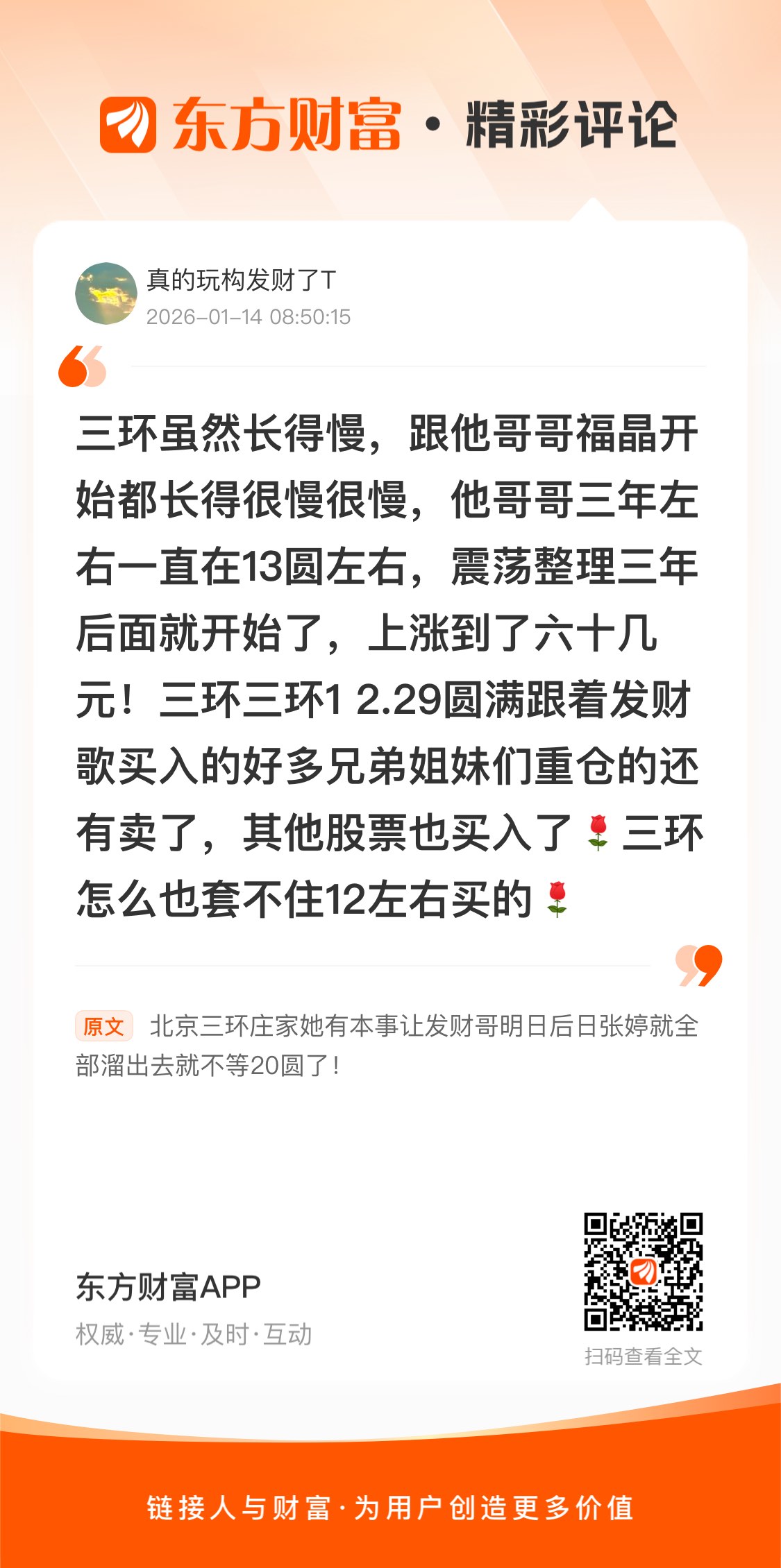 温馨提示: 1.根据《证券法》规定,禁止编造、传播虚假信息或者误导性信息,扰乱证券市场;2.用户在本社区发表的所有资料、言论等仅代表个人观点,与本网站立场无关,不对您构成任何投资建议。用户应基于自己的独立判断,自行决定证券投资并承担相应风险。《东方财富社区管理规定》