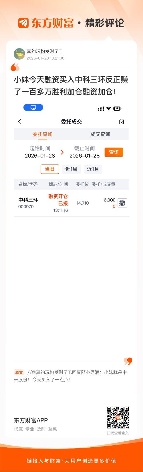 随心运满的 小妹今天融资买入中科三环反正赚了一百多万胜利加仓融资加仓!