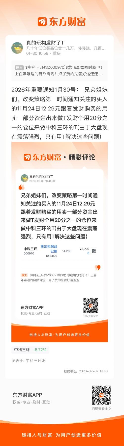 2026年重要通知1月30号: 兄弟姐妹们,改变策略第一时间通知关注的买入的11月24日12.29元跟着发财购买的用卖一部分资金出来做T发财个用20分之一的仓位来做中科三环的T(由于大盘现在震荡强烈,只有用T解决这些问题)