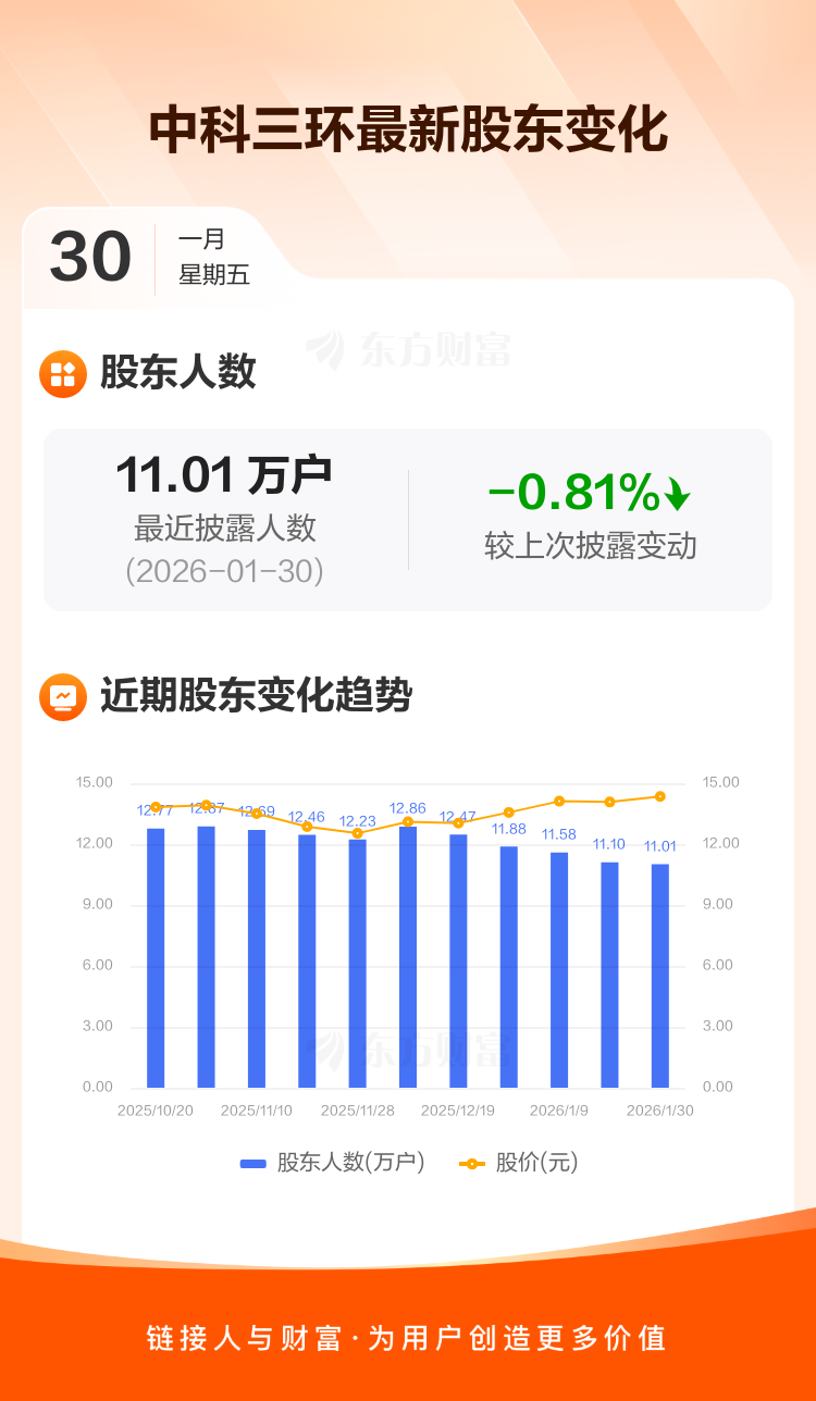 中科三环最新披露数据显示,截至1月30日公司股东户数为11.01万户,较上期(2026年1月20日)减少897户,降幅为0.81%。户均持有流通股数量由上期的1.09万股上升至1.10万股,户均持股金额由上期的15.40万元增加至15.83万元。