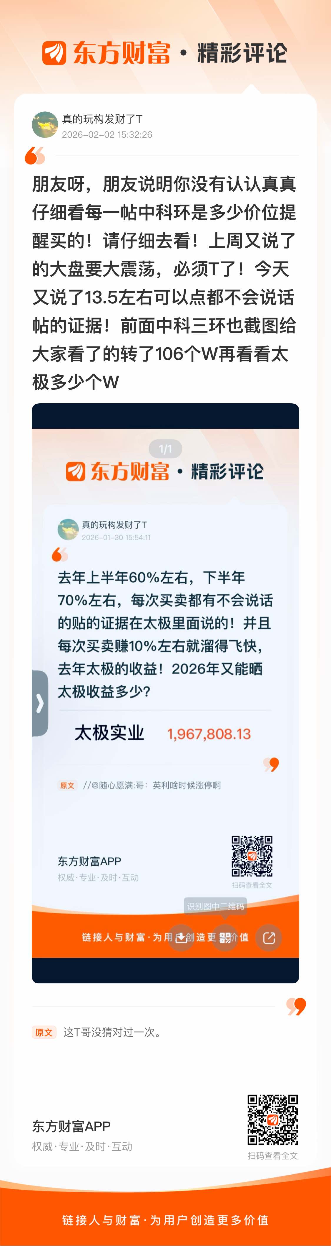 朋友呀,朋友说明你没有认认真真仔细看每一帖中科环是多少价位提醒买的!请仔细去看!上周又说了的大盘要大震荡,必须T了!今天又说了13.5左右可以点都不会说话帖的证据!前面中科三环也截图给大家看了的转了106个W再看看太极多少个W