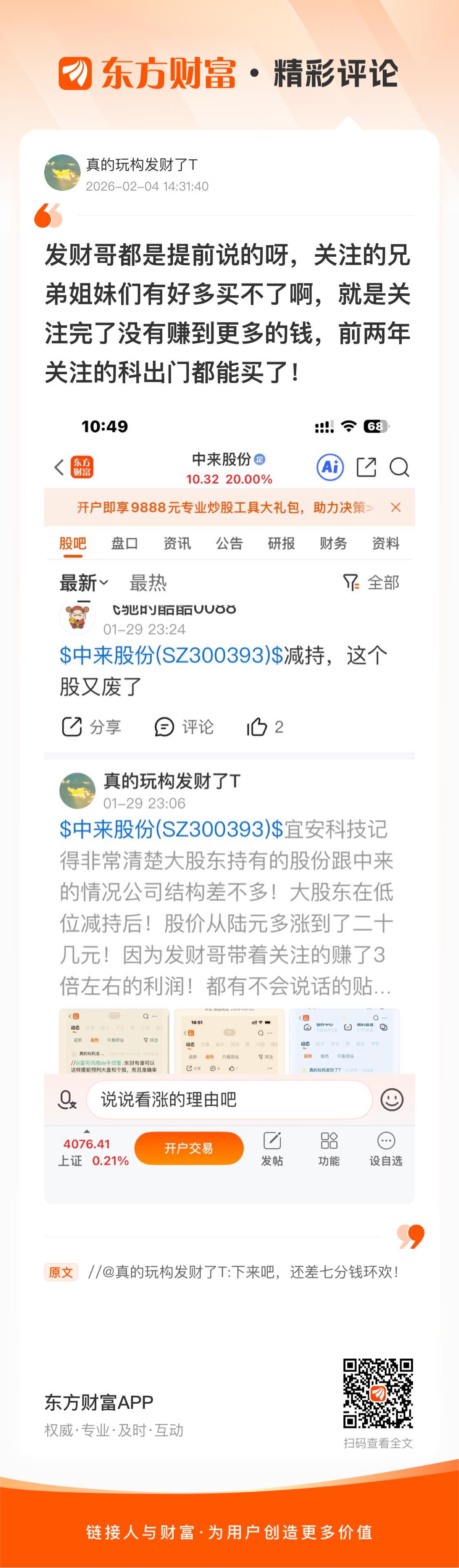 //@真的玩构发财了T : 发财哥都是提前说的呀,关注的兄弟姐妹们有好多买不了啊,就是关注完了没有赚到更多的钱,前两年关注的科出门都能买了!