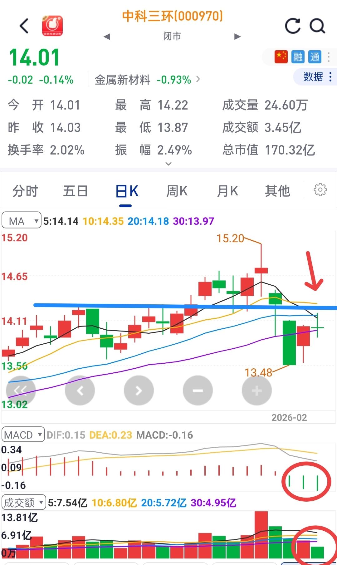 2月4日收盘小评,昨天发帖说低于14元减仓,收盘高一分,全天成交量下降,说明目前