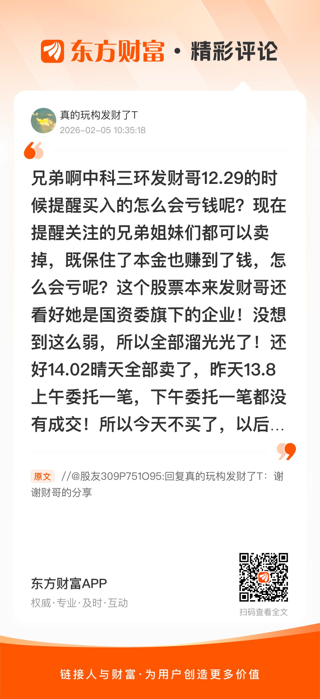//@真的玩构发财了T : 兄弟啊中科三环发财哥12.29的时候提醒买入的怎么会亏钱呢?现在提醒关注的兄弟姐妹们都可以卖掉,既保住了本金也赚到了钱,怎么会亏呢?这个股票本来发财哥还看好她是国资委旗下的企业!没想到这么弱,所以全部溜光光了!还好14.02晴天全部卖了,昨天13.8上午委托一笔,下午委托一笔都没有成交!所以今天不买了,以后也不再关注中科三环了这种弱的股票!发财哥买卖都是提前说的都有不会说话的贴的证据!