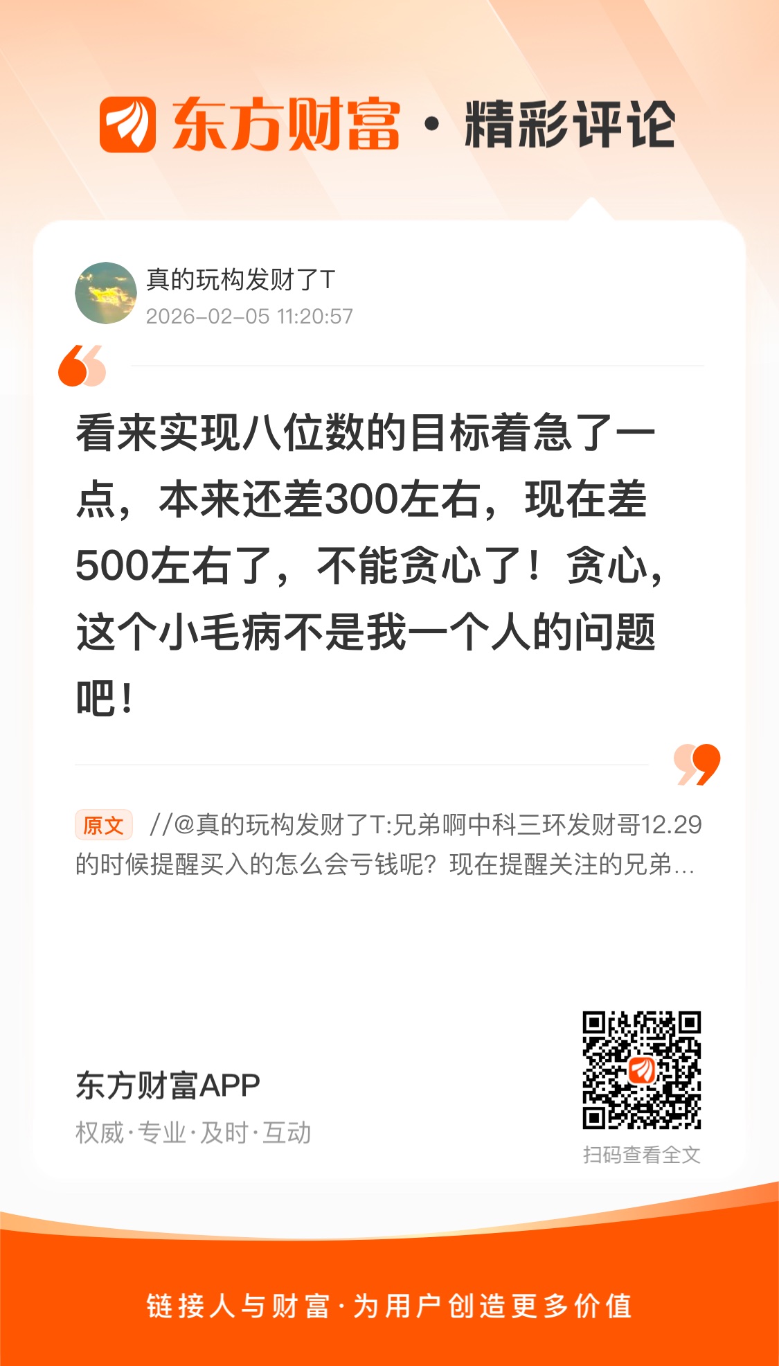 //@真的玩构发财了T : 兄弟啊中科三环发财哥12.29的时候提醒买入的怎么会亏钱呢?现在提醒关注的兄弟姐妹们都可以卖掉,既保住了本金也赚到了钱,怎么会亏呢?这个股票本来发财哥还看好她是国资委旗下的企业!没想到这么弱,所以全部溜光光了!还好14.02晴天全部卖了,昨天13.8上午委托一笔,下午委托一笔都没有成交!所以今天不买了,以后也不再关注中科三环了这种弱的股票!发财哥买卖都是提前说的都有不会说话的贴的证据!