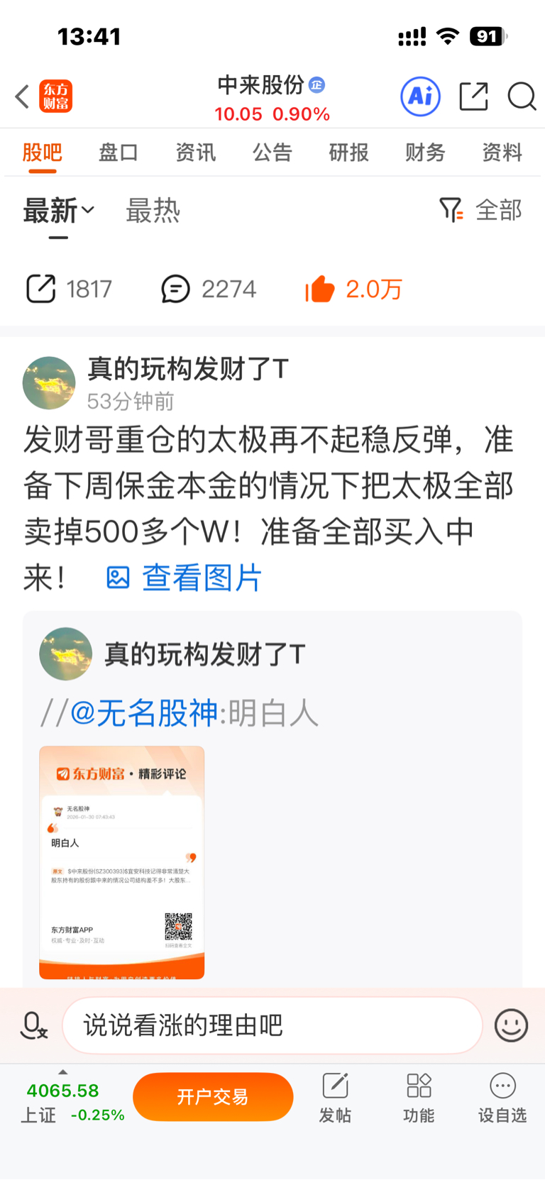$中科三环(SZ000970)$ 中科三环新全部带着兄弟姐妹们卖光光了,如果下周太极不及预期也全部卖掉!就选前几天的中来股份全仓进入!发财哥说话算话,每次买卖都有不说话的铁的证据,也有操作铁的纪律!