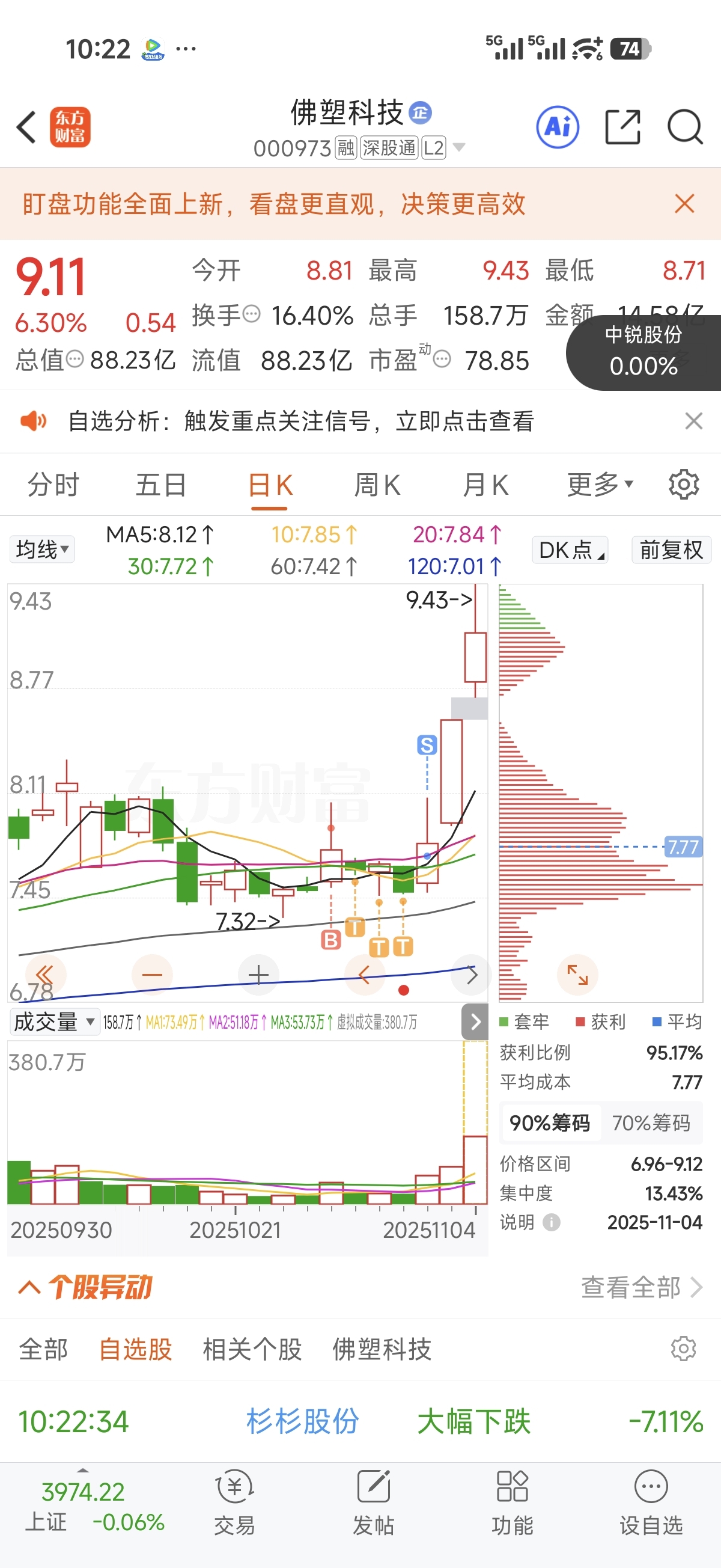 $佛塑科技(SZ000973)$ 总体是这样的,也呆了5天,天天没动静,割了就起飞,走的时候还亏点