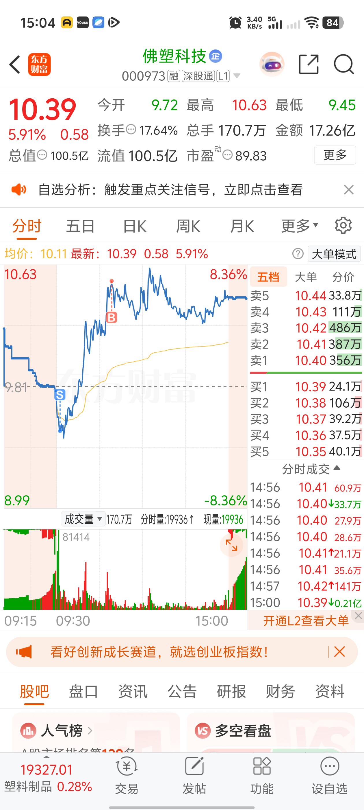 $佛塑科技(SZ000973)$ 来展示,,希望能突破上个月的2天红就可以了,,23倍才回本就把我往死里搞吧,反正就一个穷光棍了,