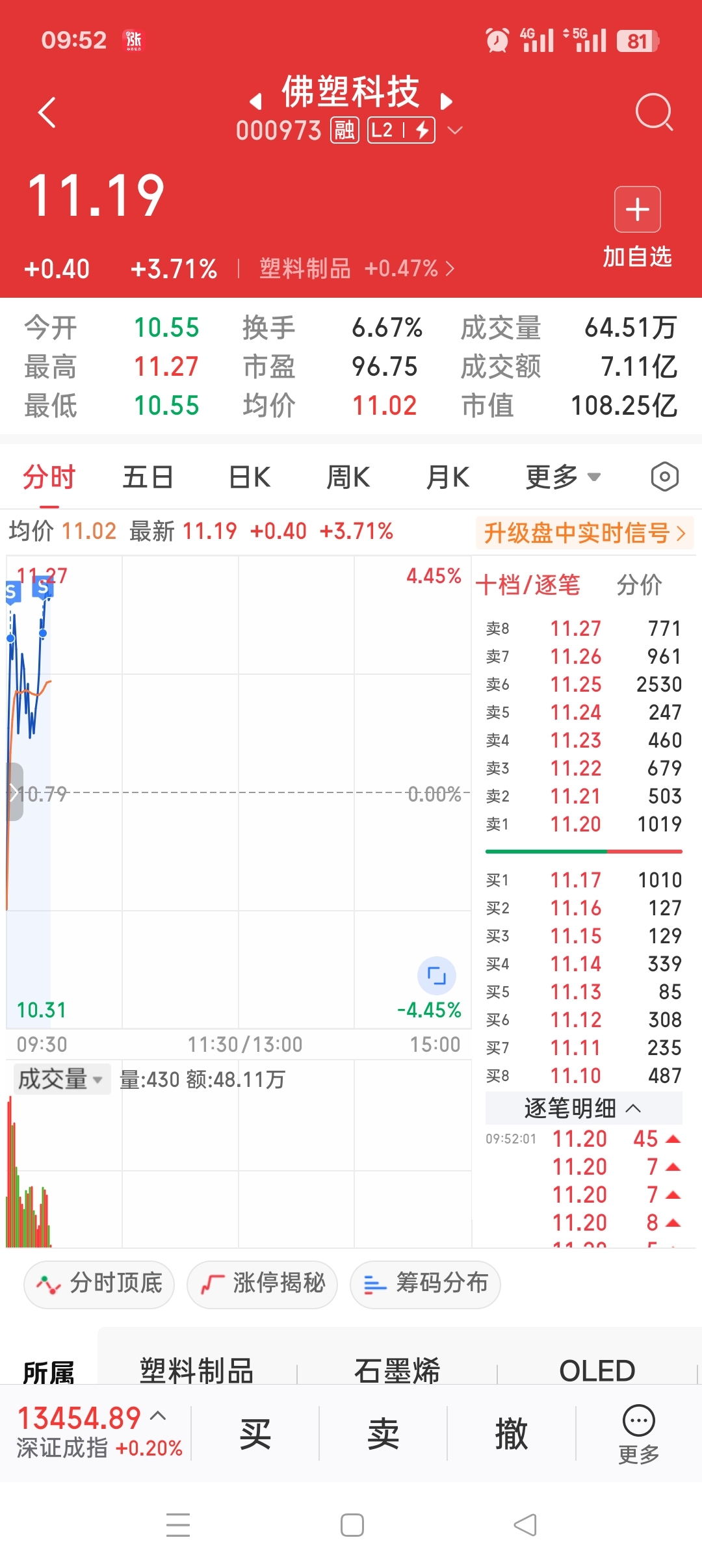 $佛塑科技(SZ000973)$ 谢谢,昨天尾盘买的,博弈反包,今天2.8个点走的。
