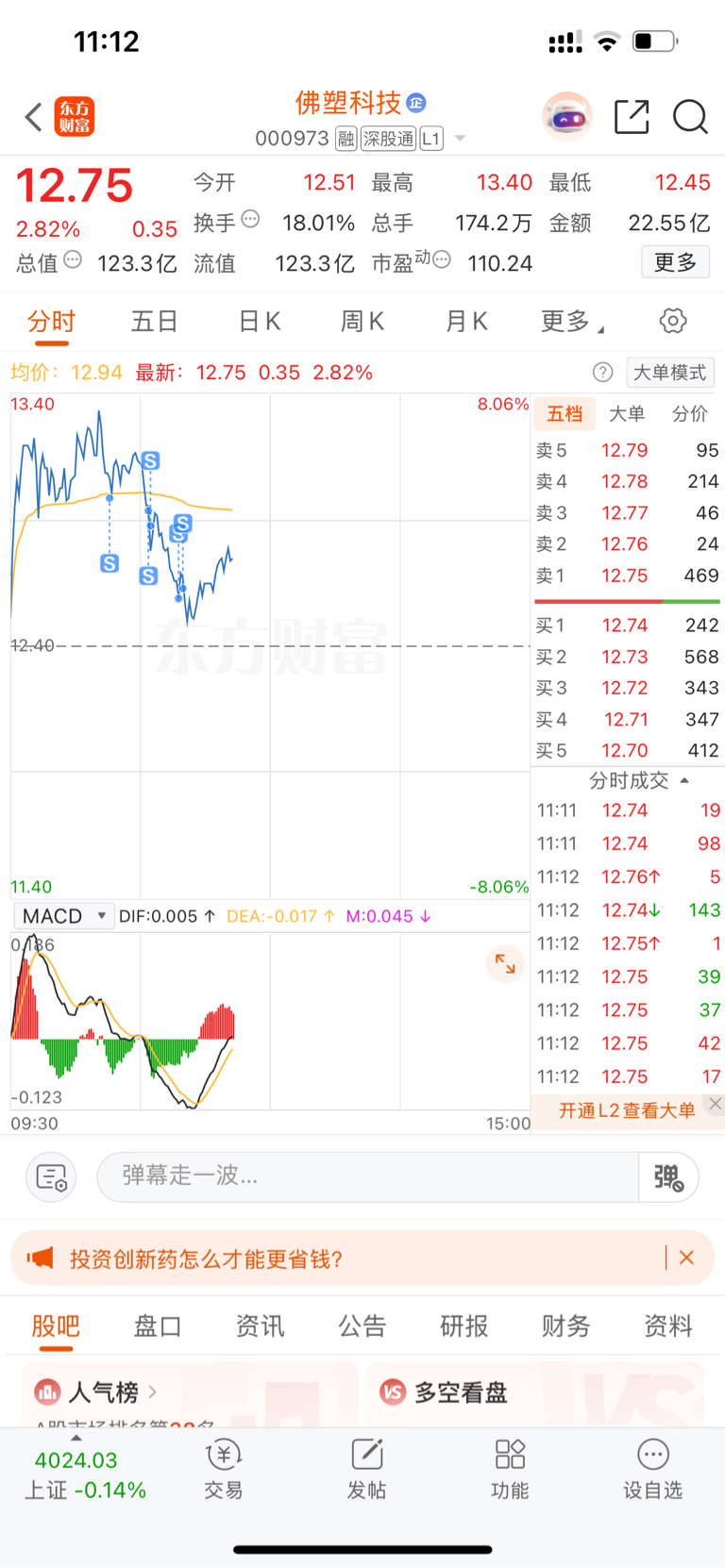 $佛塑科技(SZ000973)$ 高点没舍得出,回调出了