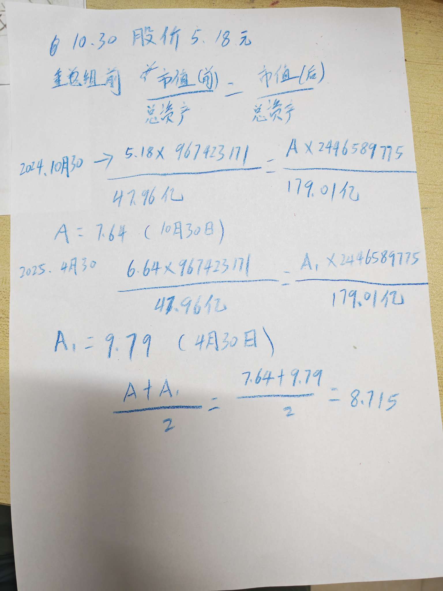 根据公开的公告和佛塑公众号的数据,只考虑总资产和总市值,取2024年10月30号和2025年4月30号两天的股价,得到了两个价格,供有缘人参考。7.64、9.79和平均值8.715。