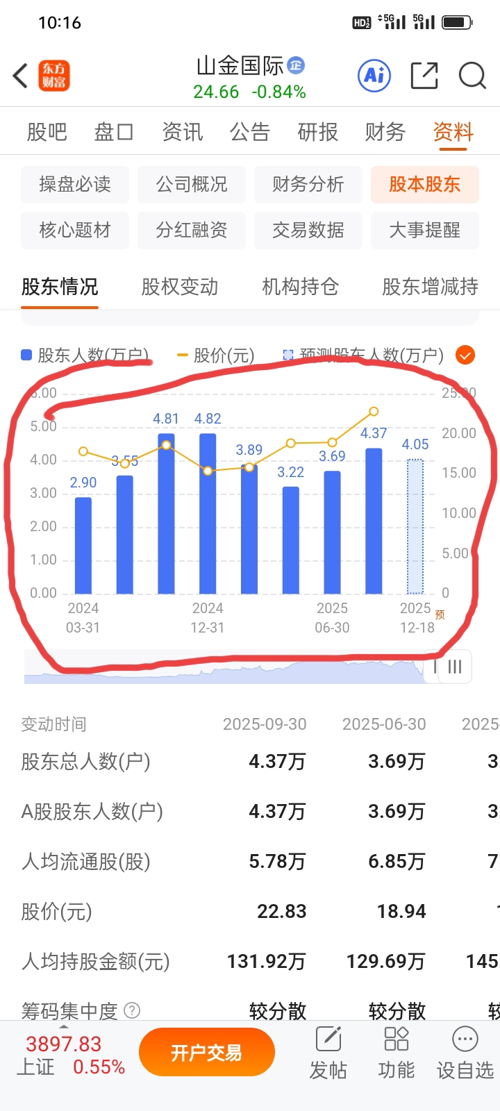 玩了6年的银泰,每年的3月份股东人数最少股价也是最高,股东人数越多股价越低,整个贵金属板块都大同小异,你们仔细看是不是这样