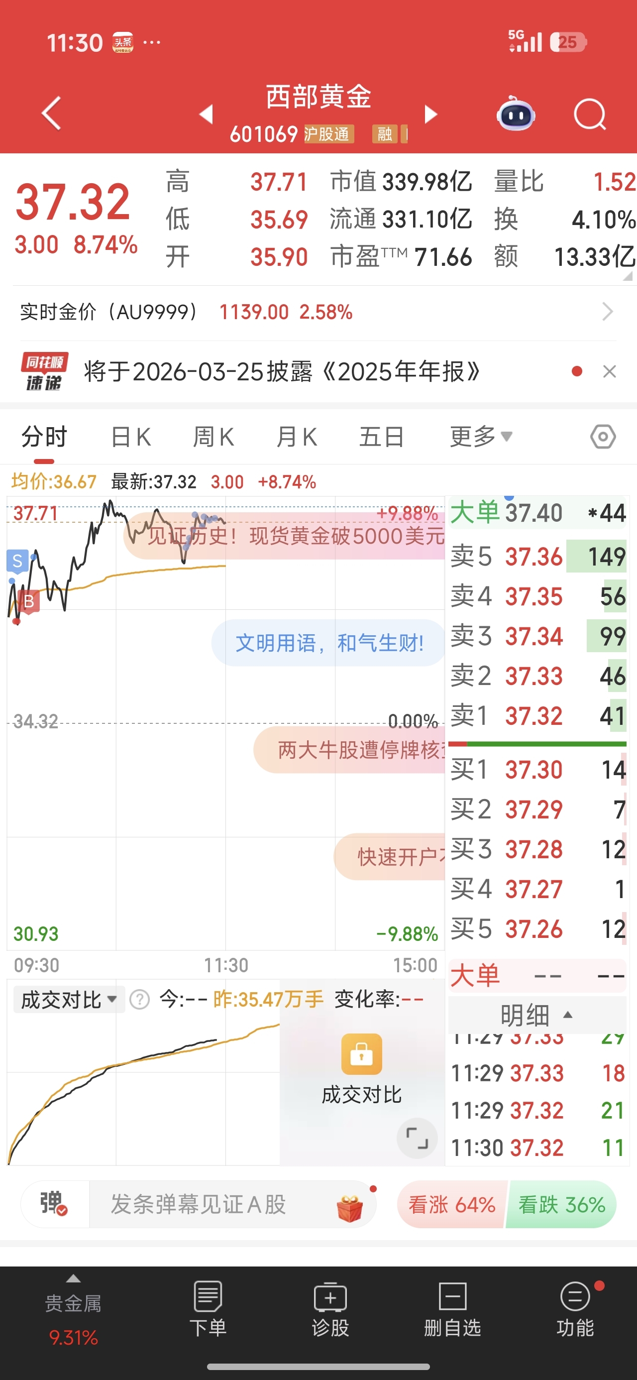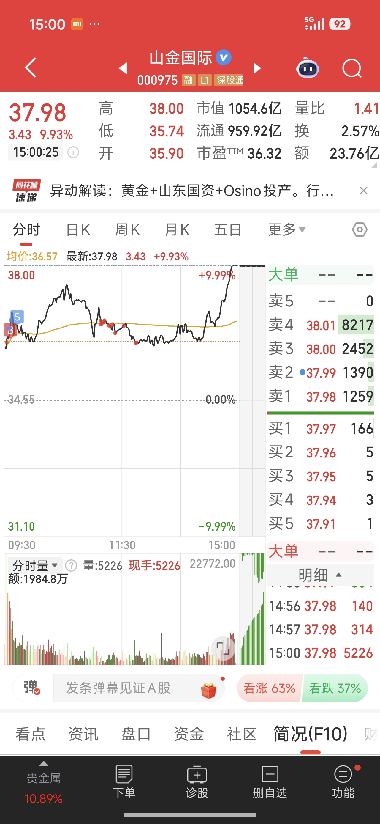 感谢山金国际主力,感谢西部黄金主力,感谢各位股友,今天也算收到一个满仓涨停