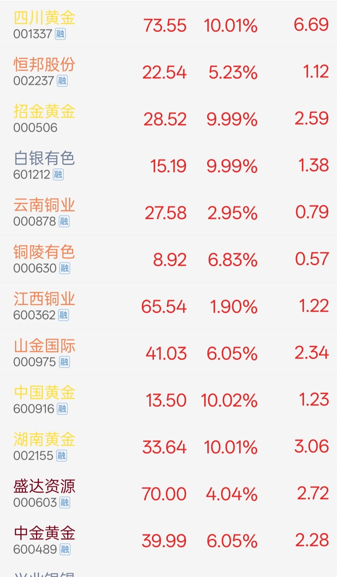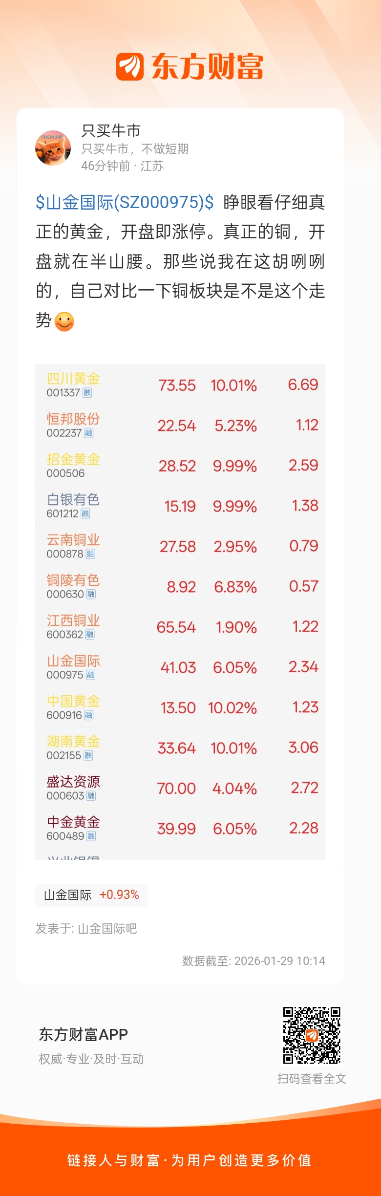 $山金国际(SZ000975)$ 睁眼看仔细真正的黄金,开盘即涨停。真正的铜,开盘就在半山腰。那些说我在这胡咧咧的,自己对比一下铜板块是不是这个走势
