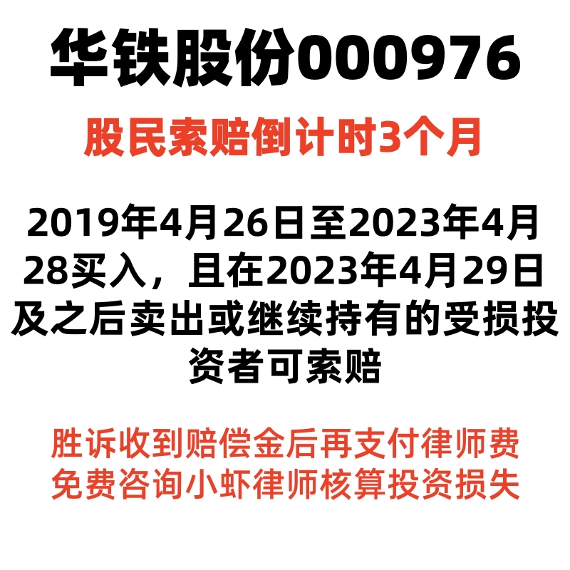 $*ST华铁(SZ000976)$ 2019年4月26日至2023年4月28日之间买入000976华铁股份,且在2023年4月29日(含当日)之后卖出或继续持有者。@索赔倒计时