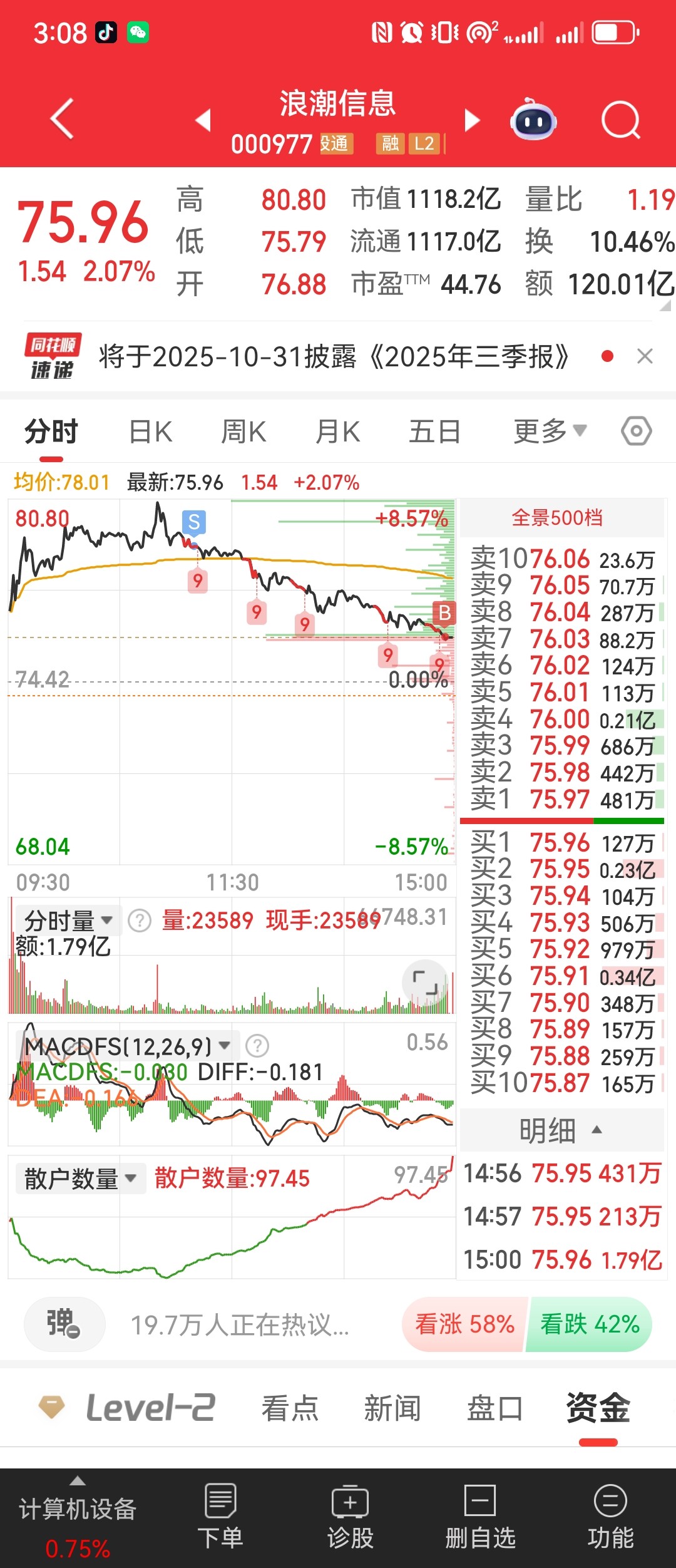 $浪潮信息(SZ000977)$ 本来自己要一骑红尘直接上板。中兴发力,35亿的封单,后面砸开了。假如:下午指数回落,能收76就不错了。 资金有分歧吧。 一致没人卖,才有戏。盘中看看 能做T,还是TT