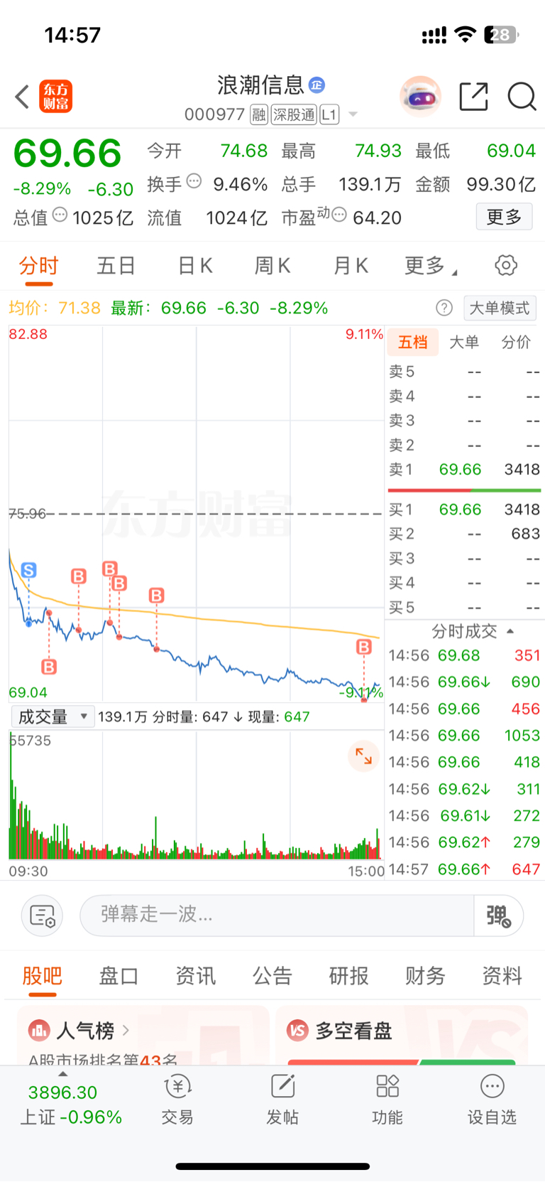 $浪潮信息(SZ000977)$ 小浪浪啊,昨天高抛你去消费了一波,今天接在半山腰,尾盘最后加仓算是对你的情怀吧,成本来到57.5元了,跌破65直接清仓,希望你下周一飞冲天