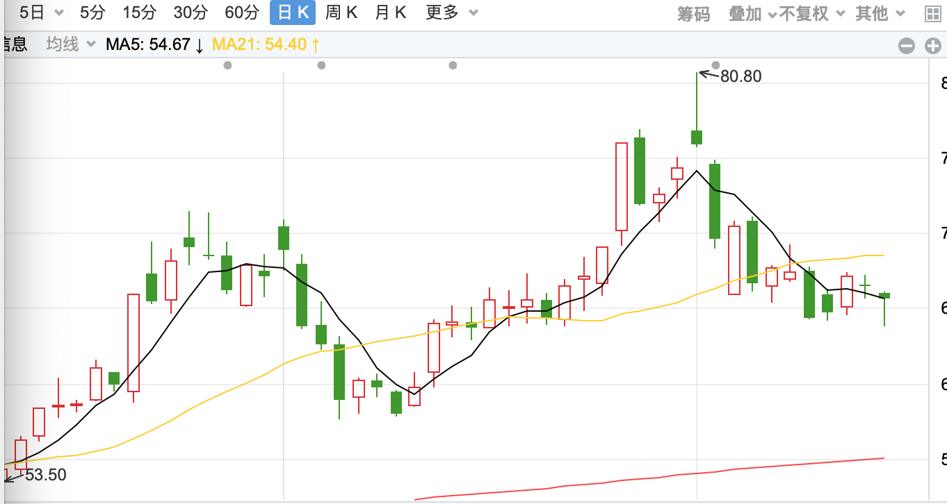 今日最低价是低于上一次的低价64.19, 创新低63.8。