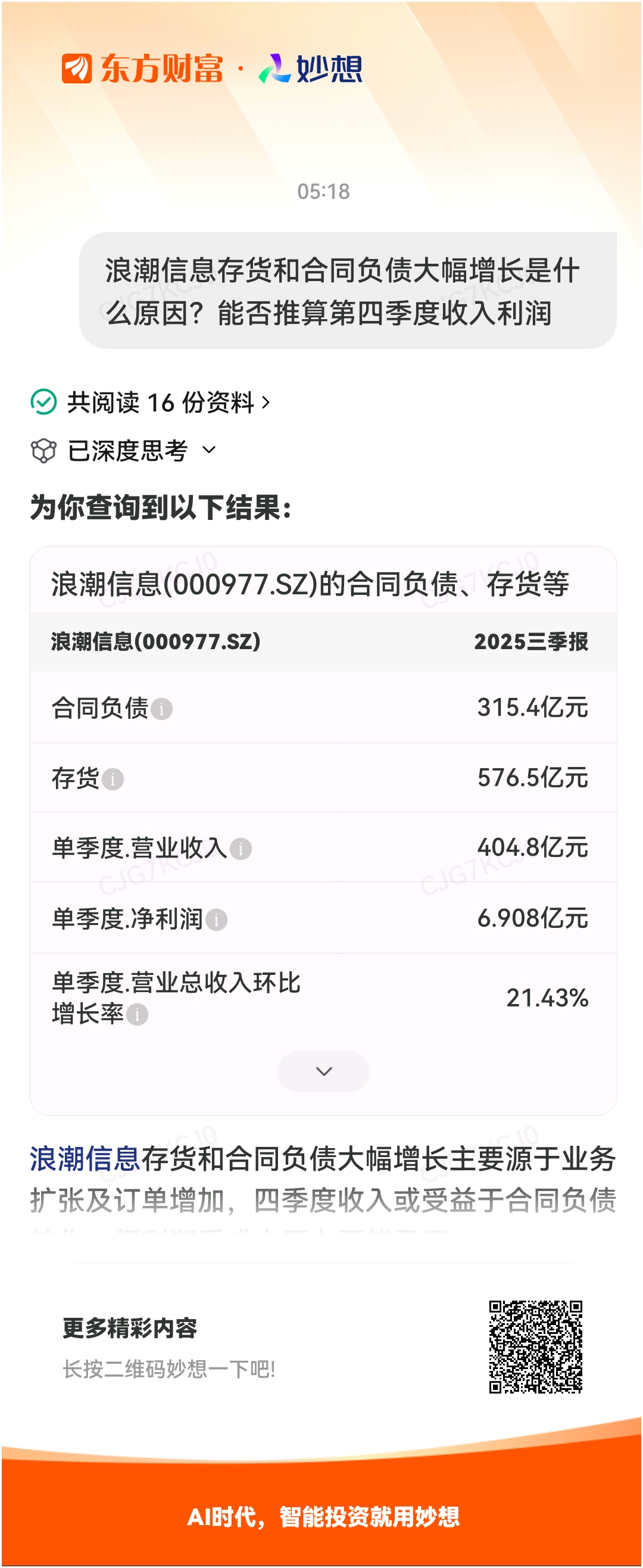 #@妙想,你怎么看?# 妙想一下:浪潮信息存货和合同负债大幅增长是什么原因?能否推算第四季度收入利润。浪潮信息存货和合同负债大幅度增长,说明公司需求大爆发,未来收入必定大爆发。$浪潮信息(SZ000977)$ $工业富联(SH601138)$ $中科曙光(SH603019)$ 。浪潮信息相对工业富联中科曙光紫光股份显著低估一倍