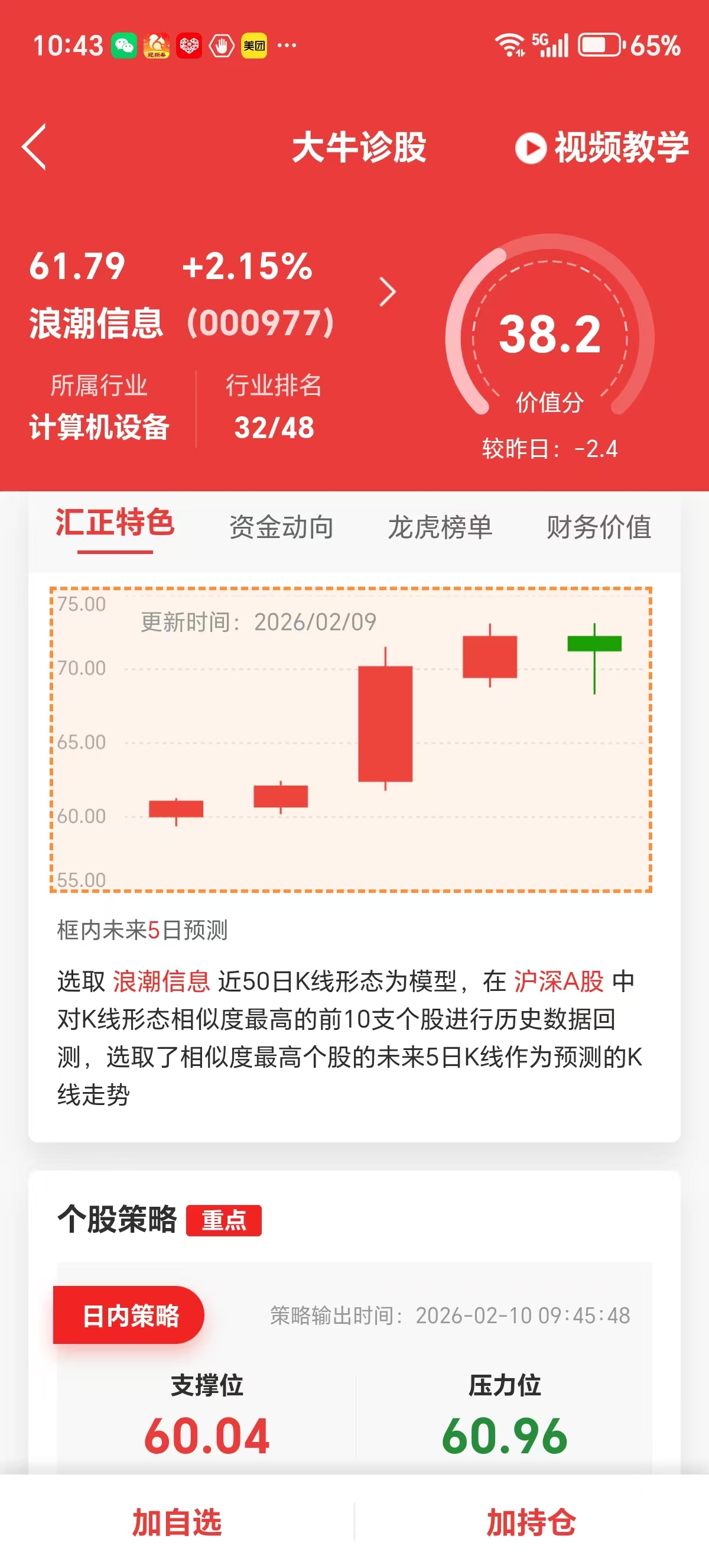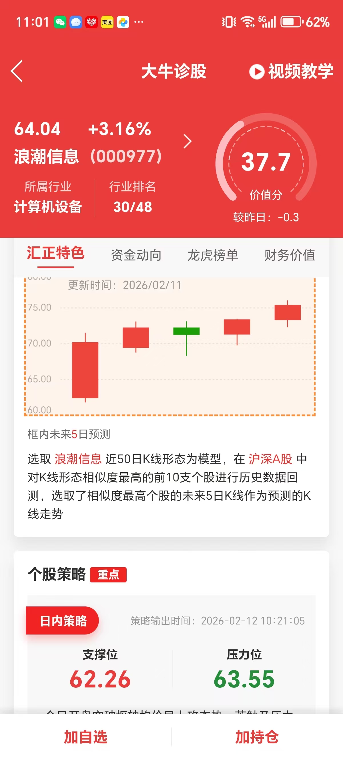 现在价61.85买入,72.5卖出,未来五日收益17%,