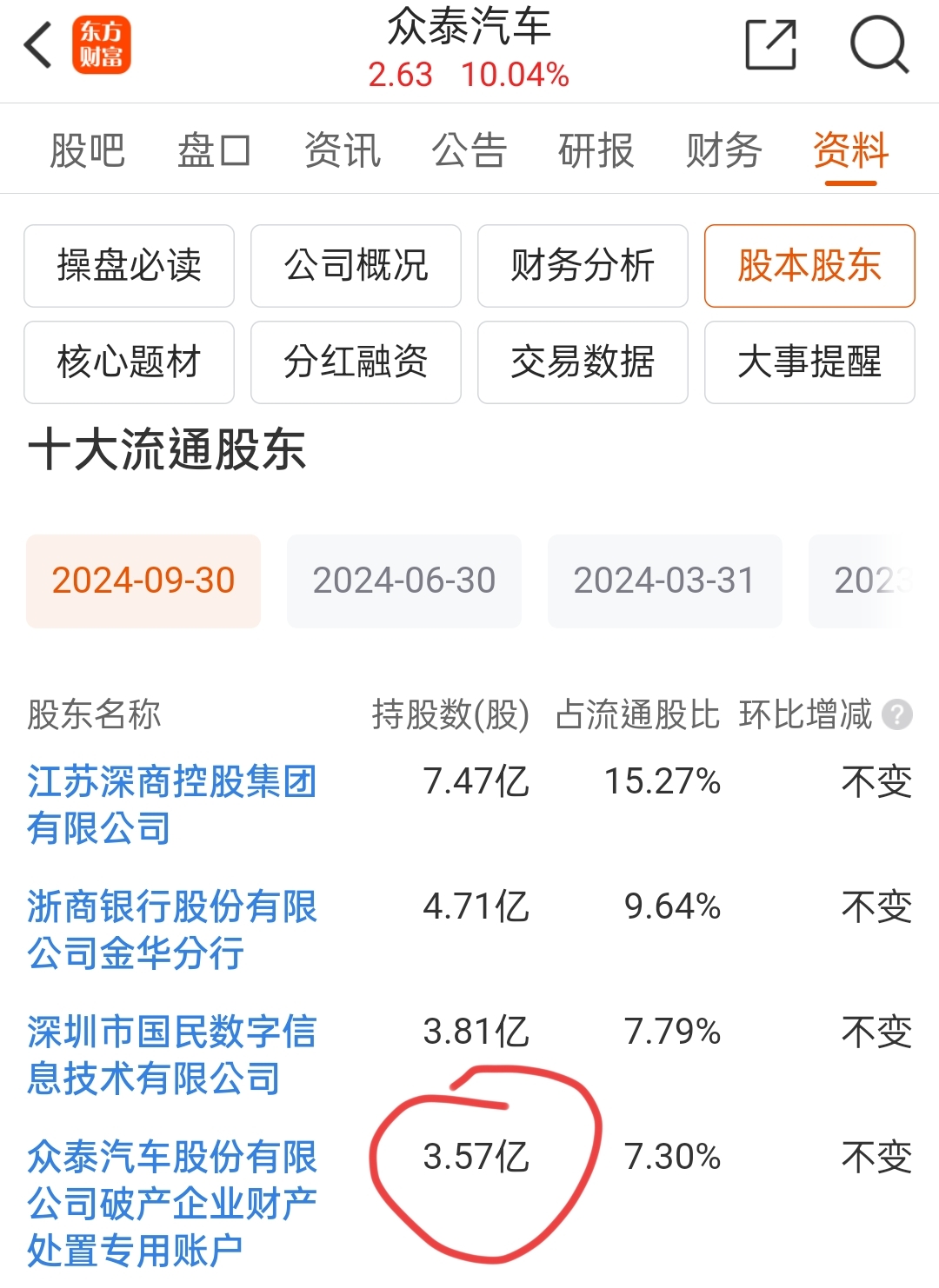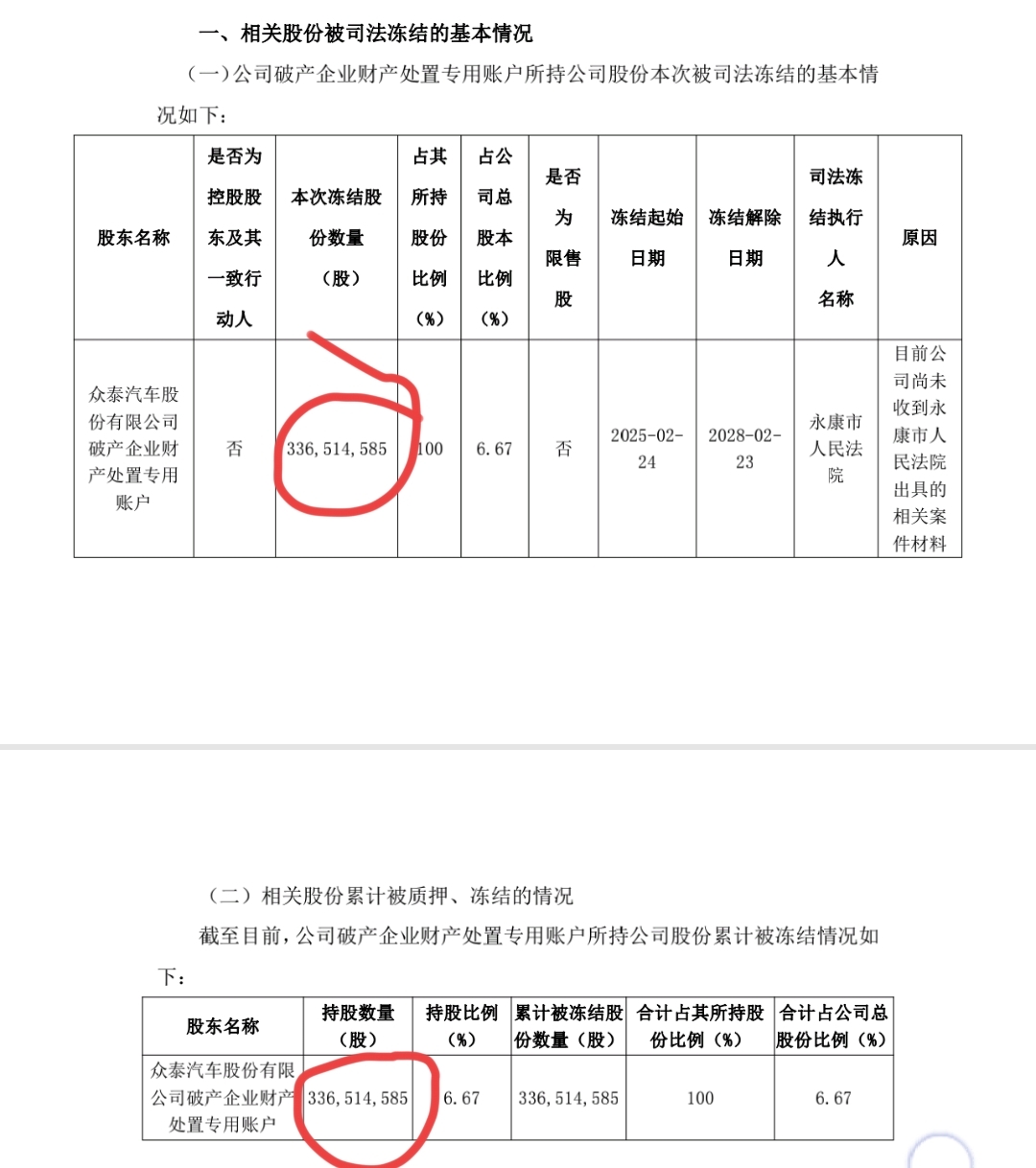 $众泰汽车(SZ000980)$ 冻结的股份数量只有3.37亿股,原先账上有3.57亿股,说明2月19号~2月21号,3个交易日贱卖了0.2亿股,0.2亿*2.2=4400万人民币,永康法院及时冻结住了,防止国有资产流失,什么时候追回0.2亿股,应该要个说法
