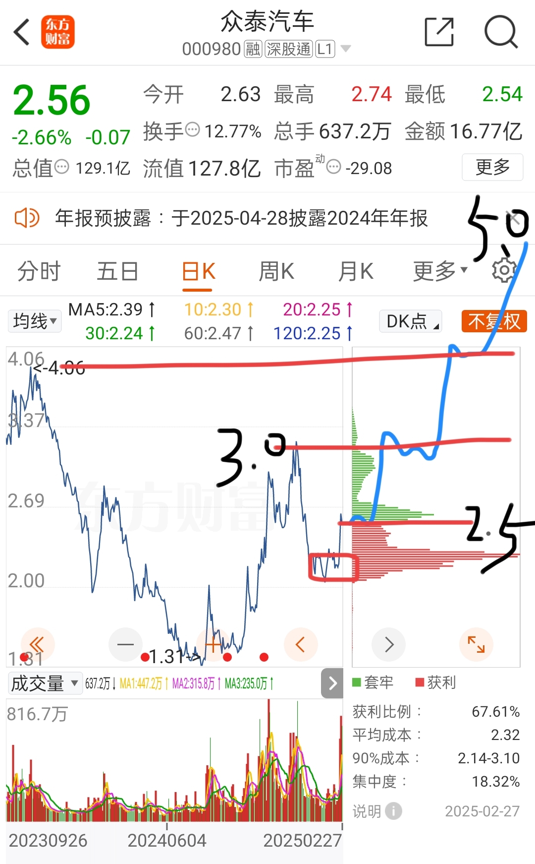 $众泰汽车(SZ000980)$ 后续几天成交量放大到800~1000多万这一波目标势必翻倍到5.0,这个月稳在2.5,下个月突破3.0冲向4.0,24年前3.55下杀恶意做空吸筹,年后横盘旗形整理吸筹,无论怎么搞依旧整不走散户,害的丽红神奇失踪个把月不叫,两个涨停才把丽红插出来,月底各大利空冻结已经曝光,局势已经成极端,股价已经极低,流通筹码有限,之前1月20多号发布破产账户减持,抛压大游资不敢硬杠,现在彻底明牌,想必魏巍这个价格也不会减持,因为他也知道大股东冻结,所以不必担心魏巍1亿股低价位减持,谁不想多卖点,所以就剩机构、散户、游资的较量,昨天深股通7000万离场,抛的越多机构越没有话语权,散户该洗走的也洗走了,洗不走的依旧狗皮膏药粘着,大家都知道重整增发的股票100%冻结到2028年了,还有什么好怕的