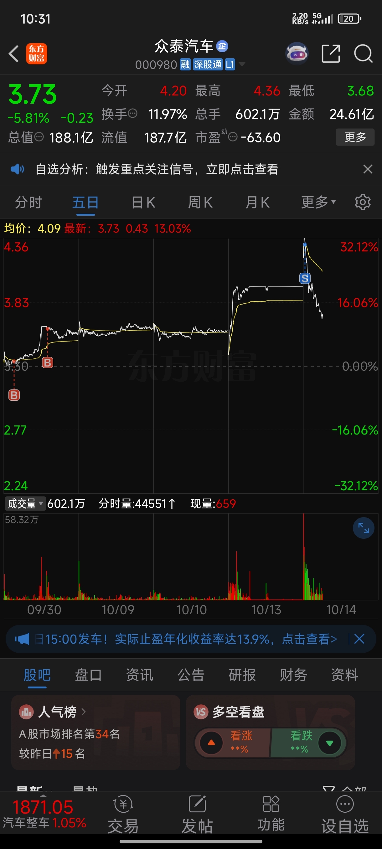 $众泰汽车(SZ000980)$ 落袋为安,晚上喝点