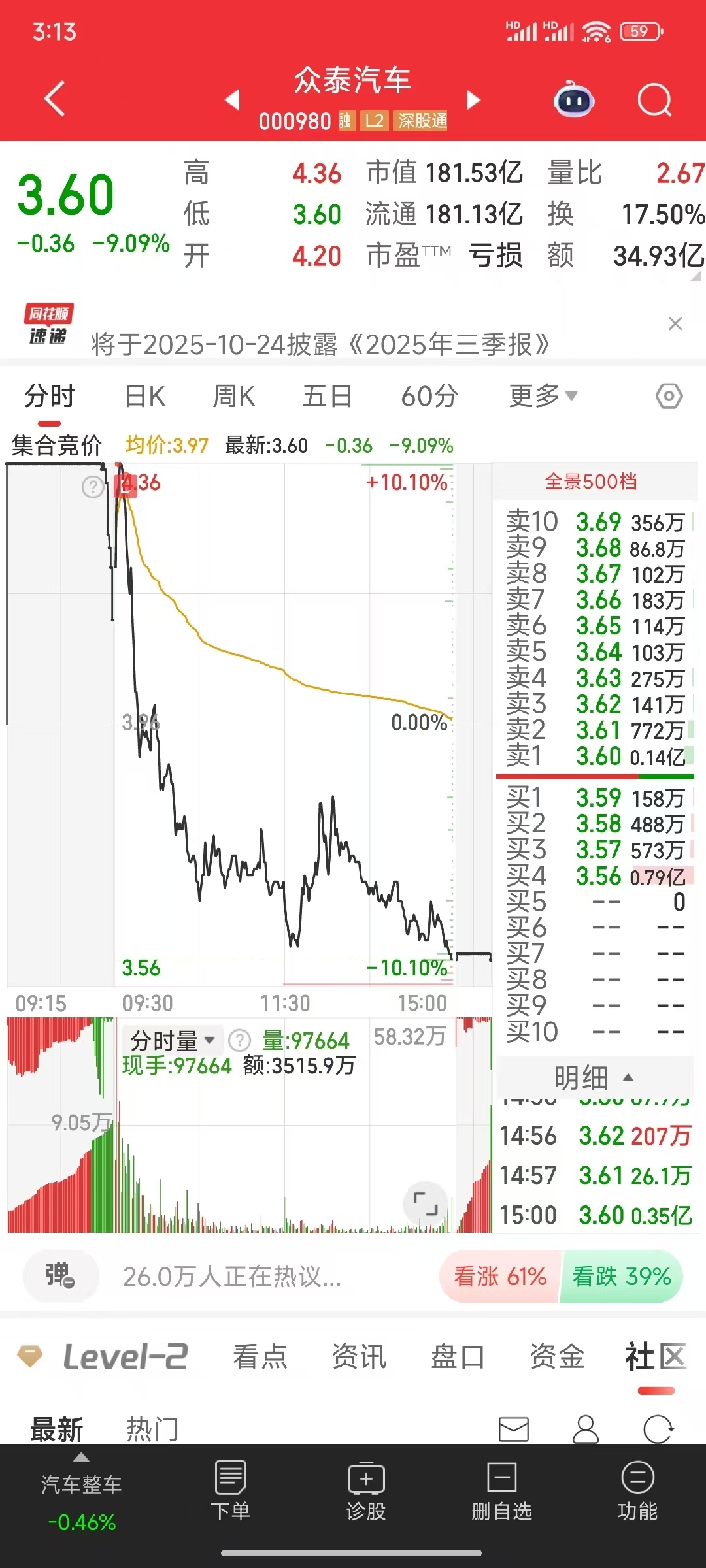 $众泰汽车(SZ000980)$ 兄弟们,我没办法了。我走不出来,短线十年,家里啥都亏光了负债累累,根本没法面对年迈的父母老婆孩子。打板进了众泰汽车,炸板爆头的那一刻我拼命忍住不流泪,我做不到稳定,亏钱是归宿,今天众泰汽车的炸板是压垮我的最后一根稻草,现在我一个人盯着屏幕眼泪止不住流