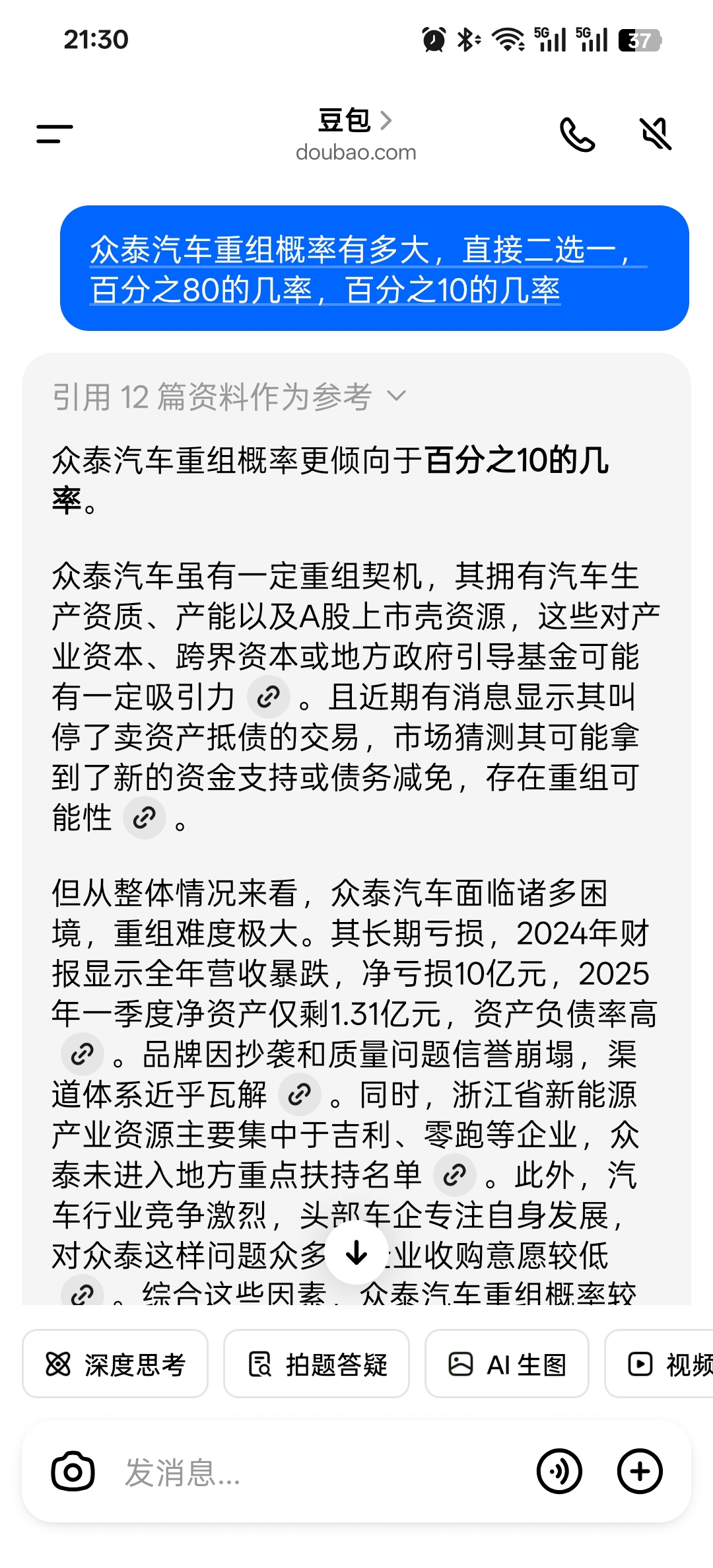$众泰汽车(SZ000980)$ 我刚问了豆包重组的几率,包哥直接带着标准答案来了