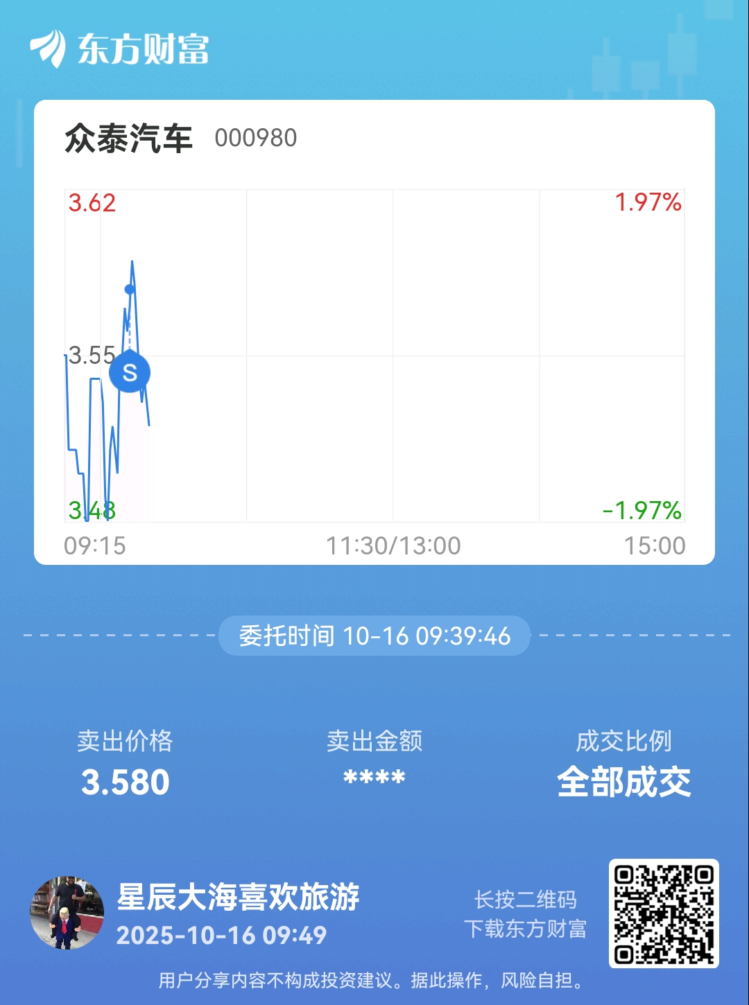 $众泰汽车(SZ000980)$ 还没企稳赚1毛先跑了