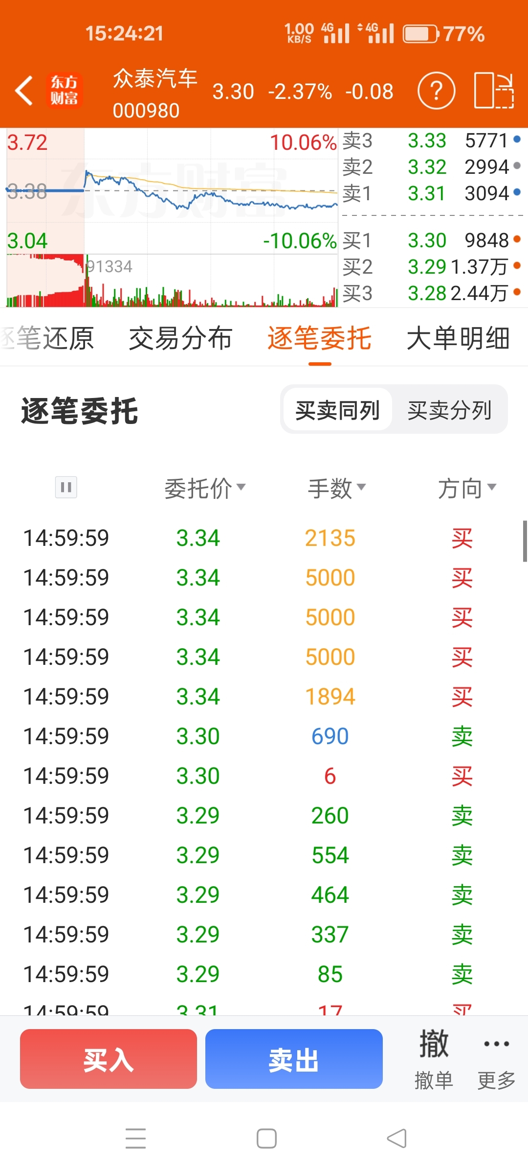 $众泰汽车(SZ000980)$ 尾盘又开始5000 5000的买了