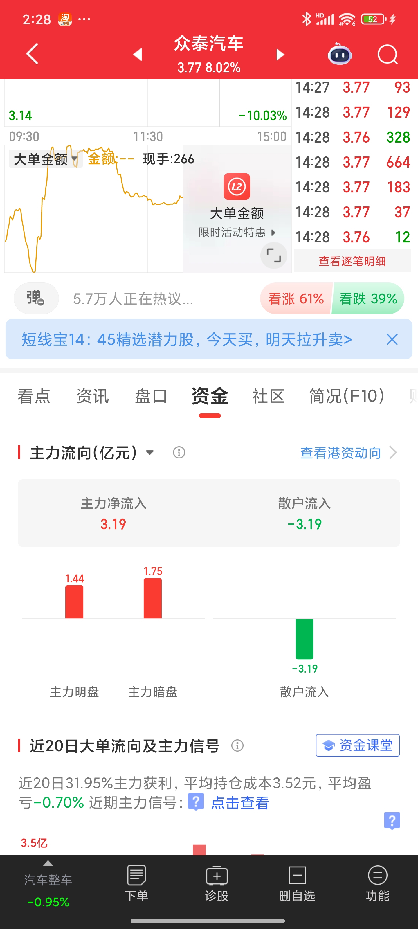 $众泰汽车(SZ000980)$ 主力这是要搞事情啊,昨天进了1.5个亿 今天又进了三个亿,主力这是 要玩一把呀